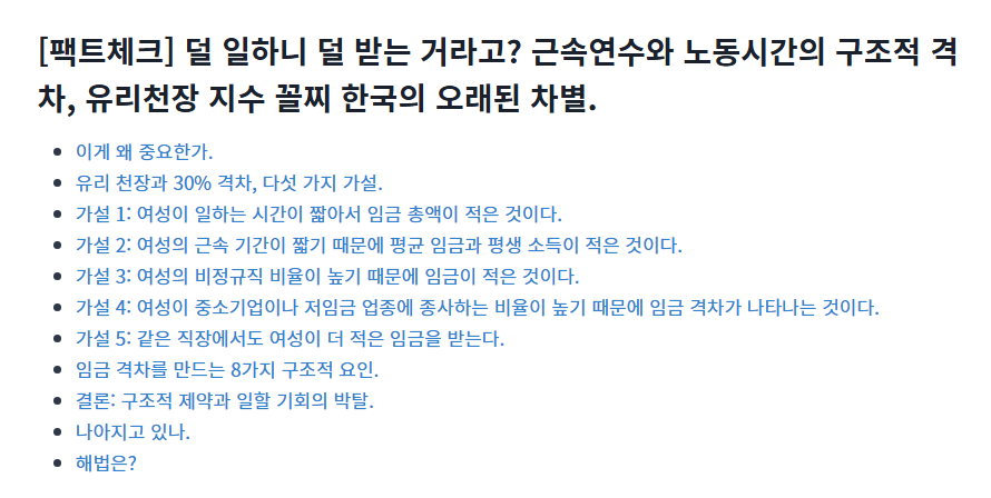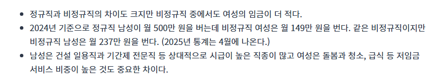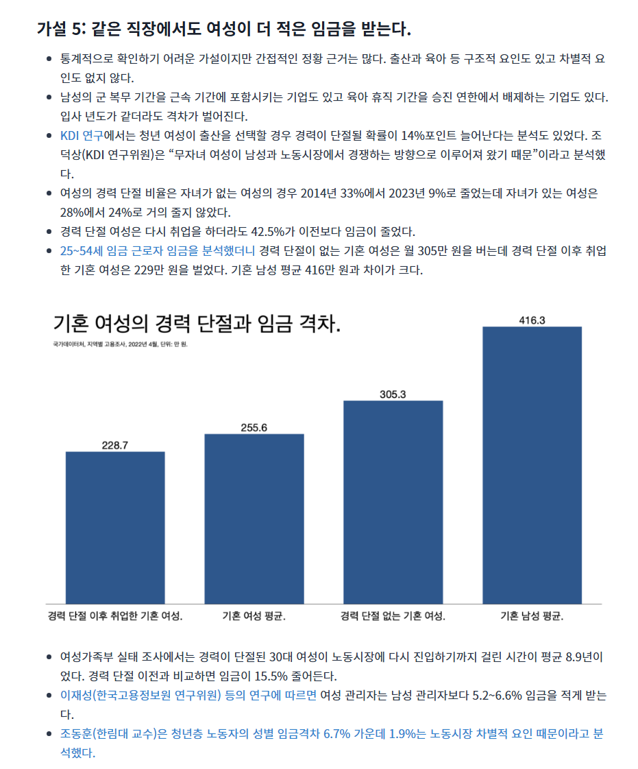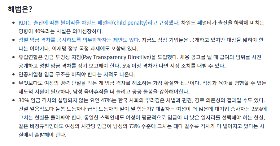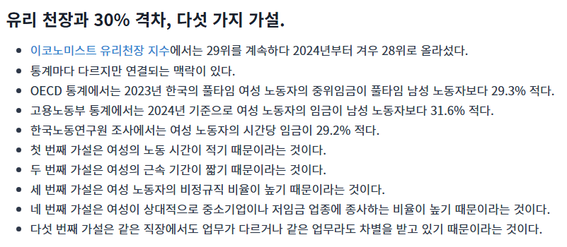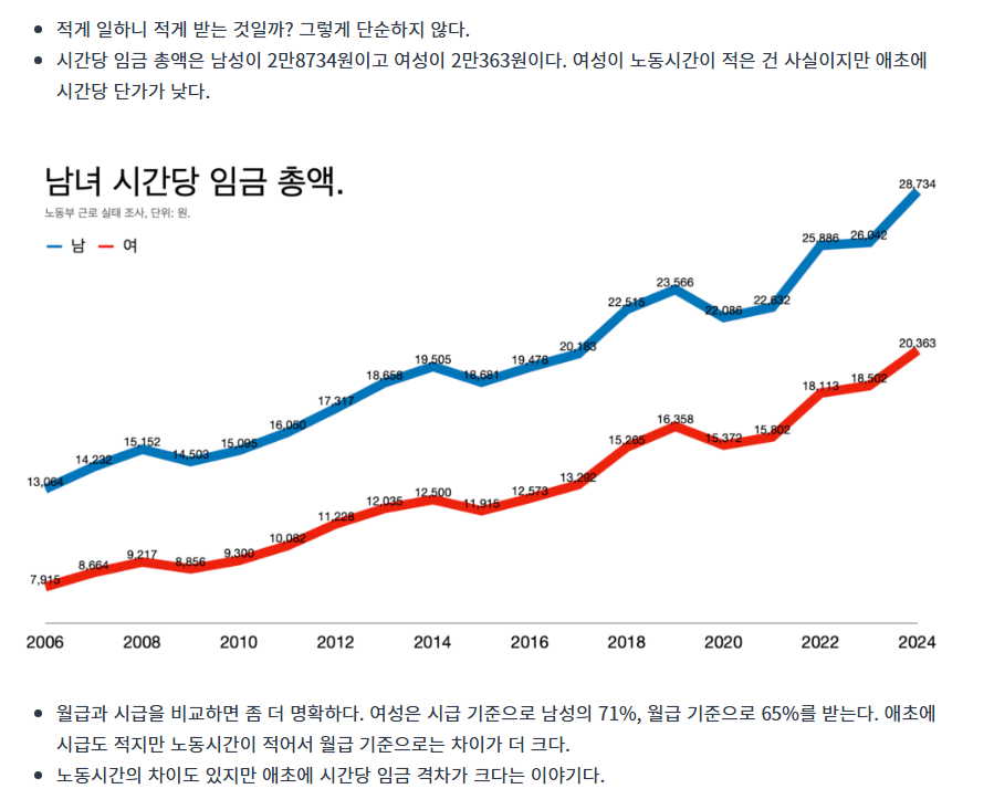 [흥미돋]한국 여성은 왜 30%를 덜 받고 일하나 작성자자본주의세상의 일인자|작성시간26.03.24|조회수3,041 목록 댓글 7 글자크기 작게가 글자크기 크게가 출처: 여성시대 자본주의세상의 일인자https://slownews.kr/156679한국 여성은 왜 30%를 덜 받고 일하나. - 슬로우뉴스.한국이 유리 천장 지수가 꼴찌라는 건 새로운 이야기가 아니다. 성별 임금 격차도 29년째 압도적인 1위다. 그런데 정작 원인이 뭔지 제대로 따져 본 적이 없다. 팩트를 짚고 구조를 분석해 보자.slownews.kr 전문은 링크에서 정리 잘 된 것 같아 가져왔어요 다음검색 현재 게시글 추가 기능 열기 북마크 공유하기 신고 센터로 신고 댓글 댓글 7 댓글쓰기 답글쓰기 댓글 리스트 작성자군밤장수2 | 작성시간 26.03.24 담타 시간도 다 까줘 샤갈 작성자내면평화좋은말만하자 | 작성시간 26.03.24 에휴 나도분몉적게받겟지 작성자2026년부자되세요 | 작성시간 26.03.24 이유없음 같은일해도 남자는 결혼하고 장가가려면 올려줌 ㅋㅋㅋㅋ 작성자한남국즈아 | 작성시간 26.03.24 한국쳐망햇으면 ㅋㅋ 작성자포포포포미닛 | 작성시간 26.03.25 이런 조사 오천번 더 해도 소용 없는게 그들도 이미 다 알고있음 ㅇㅇ 걍 모른척 하는거지 댓글 전체보기