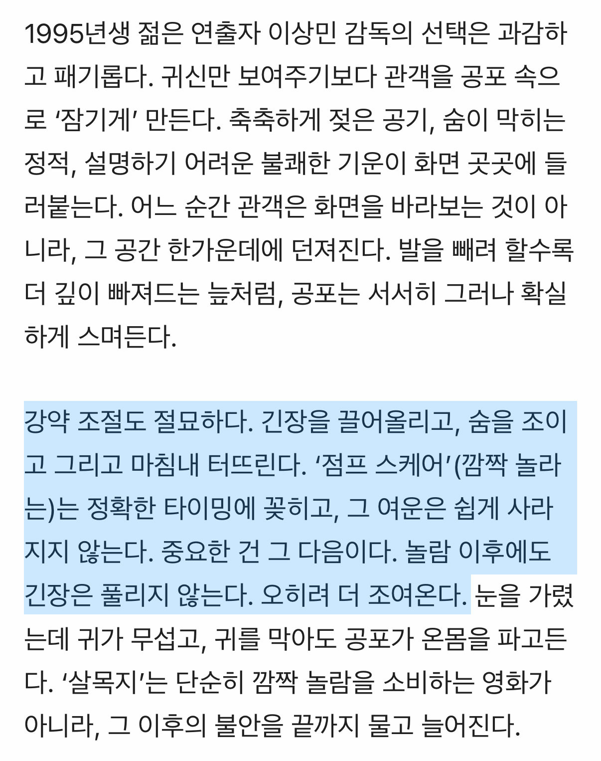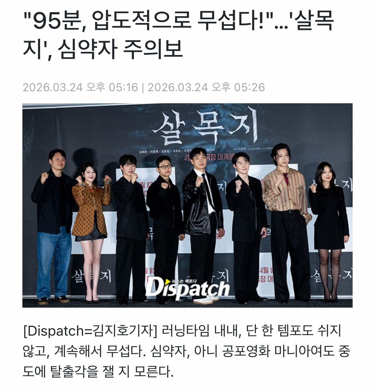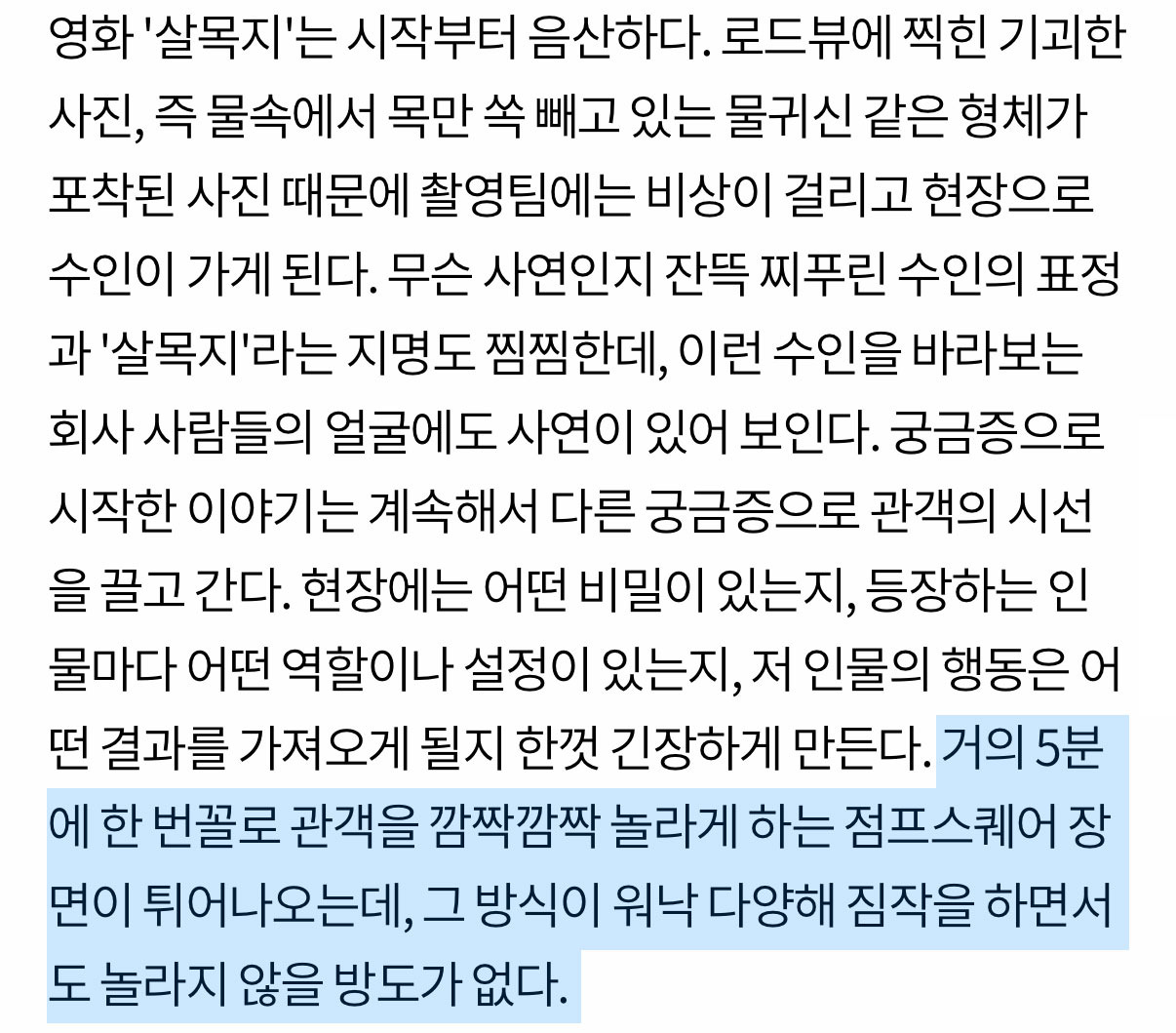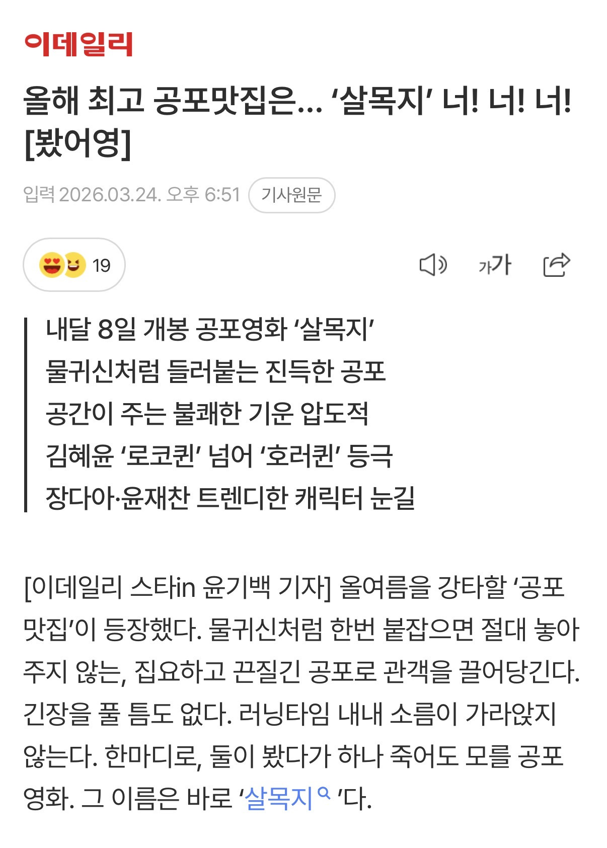 [흥미돋]실시간으로 뜨고 있는 공포 영화 <살목지> 언론 리뷰 작성자뾰족한고양이|작성시간26.03.24|조회수39,157 목록 댓글 195 글자크기 작게가 글자크기 크게가 출처: https://theqoo.net/square/4137948945 https://v.daum.net/v/20260324185202166 https://www.slist.kr/news/articleView.html?idxno=726333 http://dispatch.co.kr/2340403 https://enews.imbc.com/News/RetrieveNewsInfo/499134 다음검색 현재 게시글 추가 기능 열기 북마크 공유하기 신고 센터로 신고 댓글 댓글 195 댓글쓰기 답글쓰기 댓글 리스트 작성자뚜잇 뚜 | 작성시간 26.03.25 재밋겟다... 작성자네잎클로버 지킴이 | 작성시간 26.03.25 절대 안 봐야지 ㅜ... 개무섭겠다 하 궁금한데 절대 못볼 듯 ㅜ 작성자세상의희망 | 작성시간 26.03.25 우와우와우ㅘ 작성자프라다맥파든 | 작성시간 26.03.26 랑종때 이러고 존노잼이엇어서 고민이네 빈수레일지.. 작성자천상연 미친 정신병자야 널 사랑해 | 작성시간 26.03.26 헐 절대안볼거야 이 글만 봐도 무서움,, 댓글 전체보기