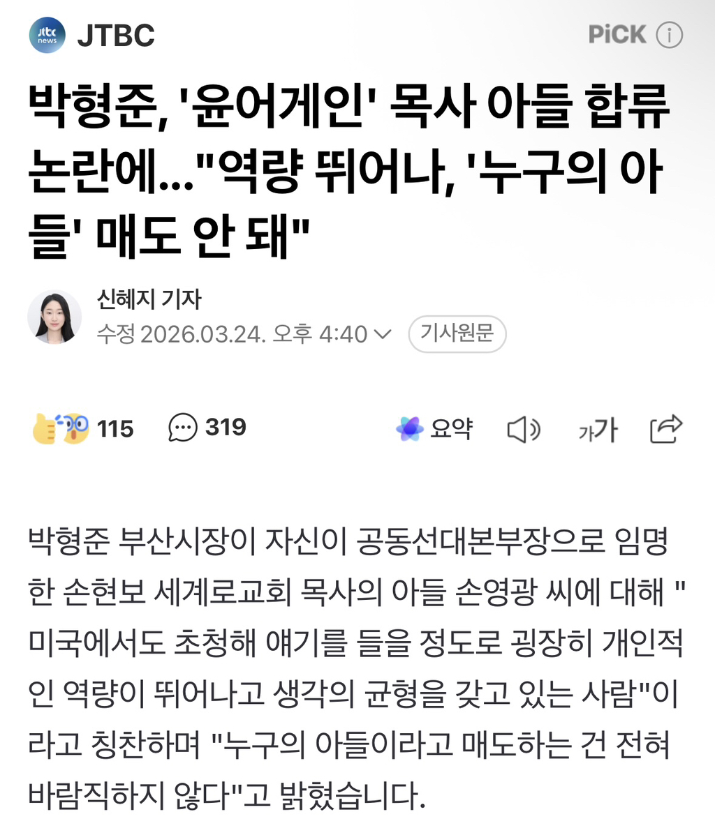 [여시뉴스데스크]박형준, '윤어게인' 목사 아들 합류 논란에..."역량 뛰어나, '누구의 아들' 매도 안 돼" 작성자소리앙|작성시간26.03.24|조회수1,363 목록 댓글 8 글자크기 작게가 글자크기 크게가 출처: https://naver.me/FYrJAkfZ박형준, '윤어게인' 목사 아들 합류 논란에..."역량 뛰어나, '누구의 아들' 매도 안 돼"박형준 부산시장이 자신이 공동선대본부장으로 임명한 손현보 세계로교회 목사의 아들 손영광 씨에 대해 "미국에서도 초청해 얘기를 들을 정도로 굉장히 개인적인 역량이 뛰어나고 생각의 균n.news.naver.com전문출처 다음검색 현재 게시글 추가 기능 열기 북마크 공유하기 신고 센터로 신고 댓글 댓글 8 댓글쓰기 답글쓰기 댓글 리스트 답댓글 작성자에혀피곤하다 | 작성시간 26.03.24 위안부도 부정 이미지 확대 답댓글 작성자에혀피곤하다 | 작성시간 26.03.24 기후위기도 부정하는 분^^ 이미지 확대 답댓글 작성자녹차라떼엥 | 작성시간 26.03.24 에혀피곤하다 이름 손부정으로 바꾸삼 작성자조쉬 코헨 | 작성시간 26.03.24 ㅋ 수준이 작성자잘빠진햄스터 | 작성시간 26.03.25 뭘 논란을.. 잘 어울리세요^^ 댓글 전체보기