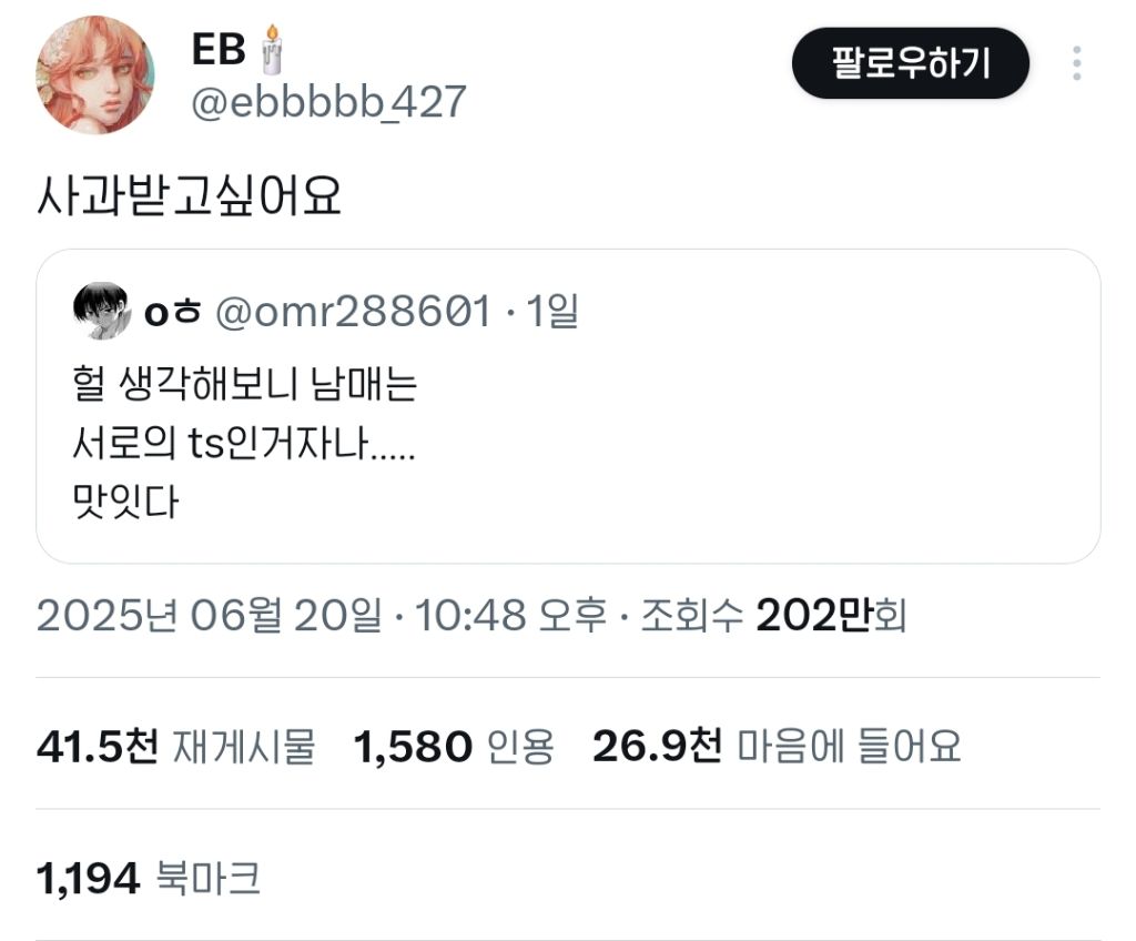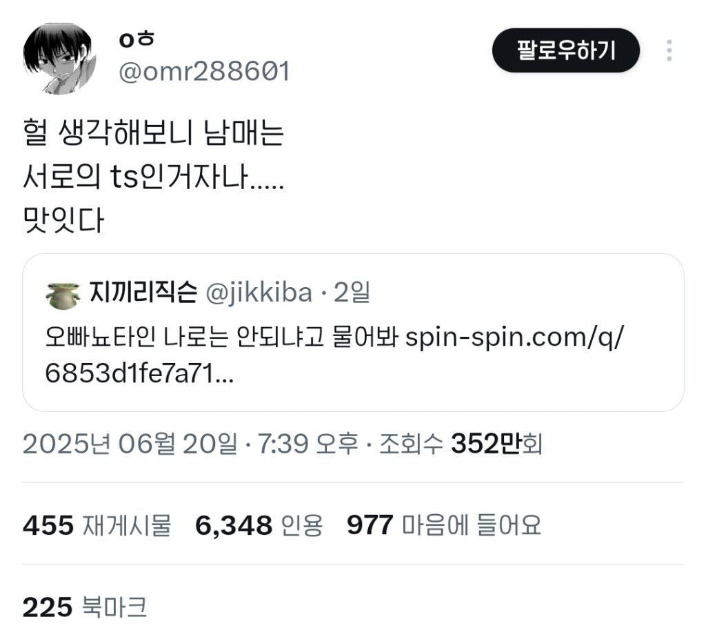 [스크랩] [기타]헐 생각해보니 남매는 서로의 ts인거자나..... 작성자퐁듀|작성시간26.03.25|조회수35,212 목록 댓글 216 글자크기 작게가 글자크기 크게가 출처: https://x.com/omr288601/status/1936011119497547907?s=19X의 oㅎ님(@omr288601)헐 생각해보니 남매는 서로의 ts인거자나..... 맛잇다x.com쌰갈 다음검색 스크랩 원문 : *여성시대* 차분한 20대들의 알흠다운 공간 현재 게시글 추가 기능 열기 북마크 공유하기 신고 센터로 신고 댓글 댓글 216 댓글쓰기 답글쓰기 댓글 리스트 작성자세이마이네임 | 작성시간 26.03.26 사과받을게 작성자섹시안경누님 | 작성시간 26.03.26 미쳤나봐 작성자착각헌터 | 작성시간 26.03.26 미쳤나 진짜 다시 봐도 열받네 작성자브라우니짱짱ㅇ | 작성시간 26.03.26 쒯 작성자하스 | 작성시간 26.03.26 ㅋㅋㅋㅋㅋㅋㅋㅋㅋ댓글들 다 귀엽다 댓글 전체보기