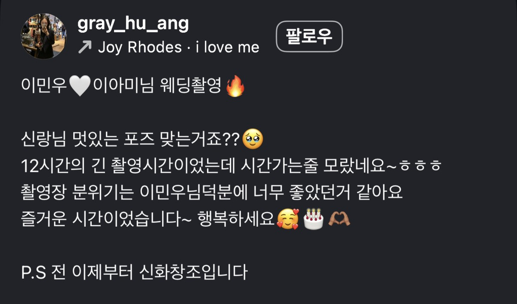 [흥미돋]신화 이민우 ♡ 이아미 웨촬.. 작성자아기간장치킨|작성시간26.03.26|조회수62,096 목록 댓글 412 글자크기 작게가 글자크기 크게가 출처: https://www.instagram.com/reel/DWU6ZfWE4JB/그렇다네요 다음검색 현재 게시글 추가 기능 열기 북마크 공유하기 신고 센터로 신고 댓글 댓글 412 댓글쓰기 답글쓰기 댓글 리스트 작성자장미꽃두고갑니다 | 작성시간 26.03.27 얼굴크기와 비율 비슷한 키작남 만나봤는데 스스로를 웃기게 만들어서 하찮음과 도태성을 무마시킴.. 작성자김밥조아너무조아 | 작성시간 26.03.27 ……. 작성자프리티포 | 작성시간 26.03.27 헐 ㅋㅋ 작성자Lime | 작성시간 26.03.29 와중에 띠동갑이라함…79 91 작성자lakeeu | 작성시간 26.04.07 댓글 개웃김ㅋㅋㅋㅋㅋ 그딴 과거ㅋㅋㅋㅋㅋㅋ 본질ㅋㅋㅋㅋㅋㅋㅋㅋㅋㅋㅋㅋㅋ 댓글 전체보기