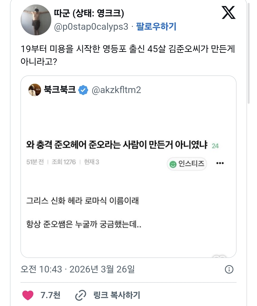 [흥미돋]준오헤어의 진실.jpg 작성자사이즈업|작성시간26.03.26|조회수19,397 목록 댓글 54 글자크기 작게가 글자크기 크게가 출처: https://theqoo.net/square/4140325823심지어 대표 여자분이심 다음검색 현재 게시글 추가 기능 열기 북마크 공유하기 신고 센터로 신고 댓글 댓글 54 댓글쓰기 답글쓰기 댓글 리스트 작성자지겨워죽겠어 | 작성시간 26.03.27 ?한남 준오아니었어..? 작성자사이코펭스 | 작성시간 26.03.27 영포티 준오가 아니였다고....? 작성자-2kg | 작성시간 26.03.27 김준오 최준오 이런 아재 아니었냐고 작성자하버드부속고등학교 | 작성시간 26.03.27 준오헤어 앞으로 애용한다 작성자이리일디 | 작성시간 26.03.27 설마 주노..? ㅋㅋㅋㅋ 준오헤어 여성대표였구나 ㅋㅋ 댓글 전체보기