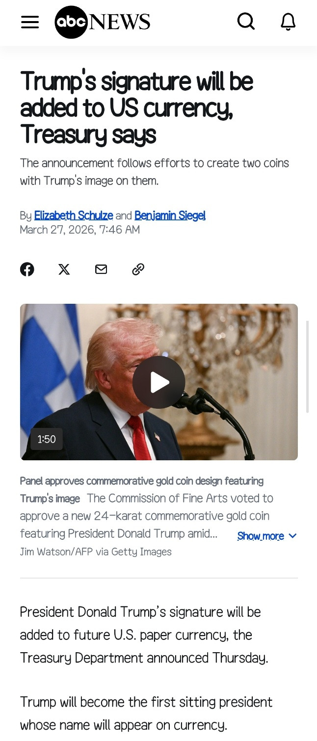출처: https://abcnews.com/Politics/trumps-signature-added-us-currency-treasury/story?id=131451419