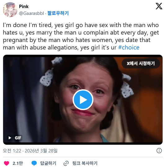 작성자하또 작성시간 26.03.28 ㅇㅇ 남미새들 냅둬야돼 걔들이 남자하나 전적으로 평생 전담마크 해주게 냅두면 됨ㅋㅋㅋㅋ