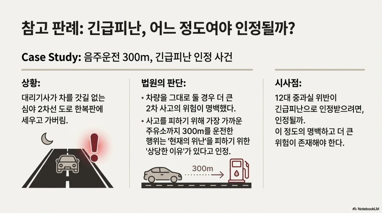 -일단 음주 만취 상태로 야간 300미터 운전이 긴급 피난으로 인정 받은 경우가 있음
