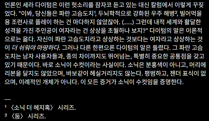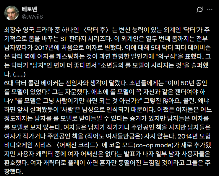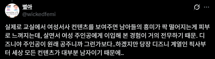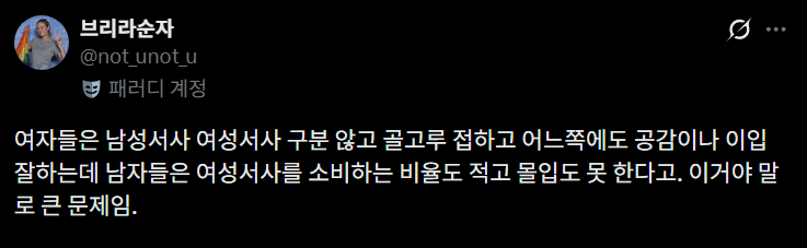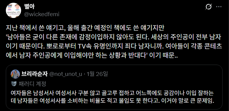 [스크랩] [흥미돋]여자들은 남성서사 여성서사 구분 않고 골고루 접하고 어느쪽에도 공감이나 이입을 잘하는데 남자들은 여성서사에 몰입하지 못함.twt 작성자solulu|작성시간26.03.28|조회수2,825 목록 댓글 10 글자크기 작게가 글자크기 크게가 출처: 여성시대 마크 미첨 사진 누르면 출처 트윗으로 이동 다음검색 스크랩 원문 : *여성시대* 차분한 20대들의 알흠다운 공간 현재 게시글 추가 기능 열기 북마크 공유하기 신고 센터로 신고 댓글 댓글 10 댓글쓰기 답글쓰기 댓글 리스트 작성자Akig | 작성시간 26.03.28 아 진짜 제목 개공감 !!!!!!!!! 작성자씨네큐 | 작성시간 26.03.28 ㄹㅇ 어느 장르든 여자 주인공이면 남자들 개난리에 후려치기, 별테 개심해 작성자민트롤케이크 | 작성시간 26.03.28 ㅇㄱㄹㅇ 작성자새라핌 | 작성시간 26.03.28 지능이 떨어지니 그런 거죠 공감이 지능의 일종인데 작성자흠냠냐 | 작성시간 26.03.29 윗댓들 너무 공감하고 그래서 어떤 판소는 젠더가 없는 세계관이더라ㅋㅋㅋㅋ신선했음 댓글 전체보기