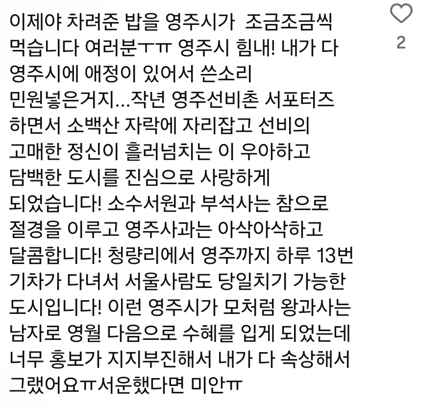 정작 왕사남 역사랑 관련없는 지역까지 다 나서서 노젓고 있는데 영월 다음으로 특수탄 영주시가 가만히 멀뚱멀뚱 보고만 있냐는 민원 듣다 각성한 경북 영주시