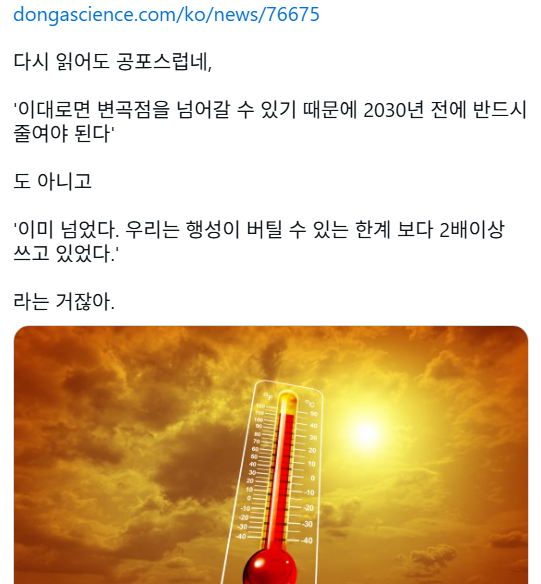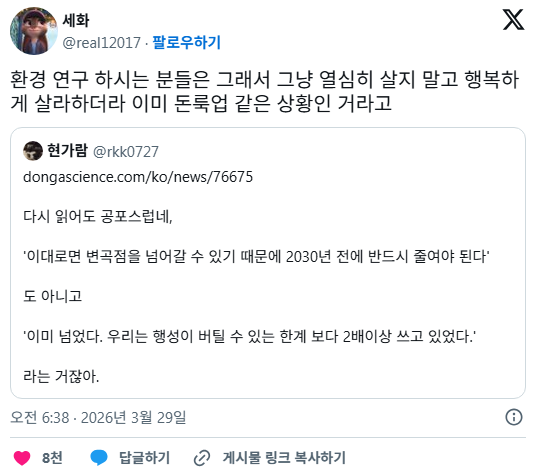 [흥미돋]“이미 넘었다. 우리는 행성이 버틸 수 있는 한계 보다 2배이상 쓰고 있었다” 작성자귤토끼이|작성시간26.03.29|조회수35,460 목록 댓글 58 글자크기 작게가 글자크기 크게가 출처: https://theqoo.net/square/4143679956 https://x.com/rkk0727/status/2037841059993285000? https://www.dongascience.com/ko/news/76675 https://x.com/real12017/status/2038007723909071327? 다음검색 현재 게시글 추가 기능 열기 북마크 공유하기 신고 센터로 신고 댓글 댓글 58 댓글쓰기 답글쓰기 댓글 리스트 작성자관심법사 | 작성시간 26.03.30 인도 중동 중국 반으로 줄여야만 작성자돈많은여자 | 작성시간 26.03.30 그게 언젠데 작성자졸랴용 | 작성시간 26.03.30 저런데두 전용기타고 가까운곳 다니는 외국스타들보면 진짜 작성자듀아아아아 | 작성시간 26.03.30 그냥 하루하루 감사하면서 살아야겠다 작성자뿜빰빰뿜빰 | 작성시간 26.03.30 멸종하는거지 뭐.. 댓글 전체보기