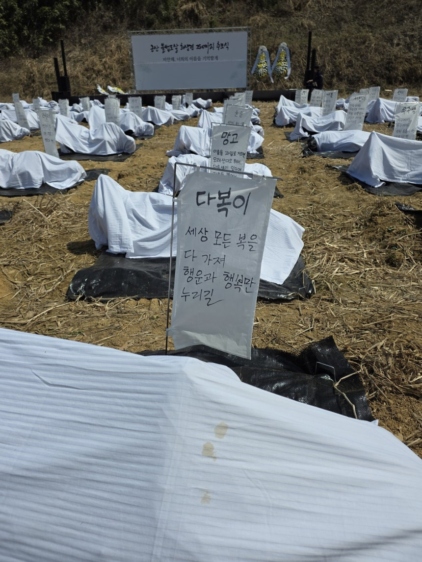 29일 군산 개도살 사건 추모 시민행동의 한 관계자의 말이다. 수의사단체, 장례업체, 그리고 시민들로 구성된 이 단체는 잔인한 방법으로 도살된 뒤 2~3년간 방치된 수백마리 개들을 위해 이날 추모식과 장례를 치렀다.