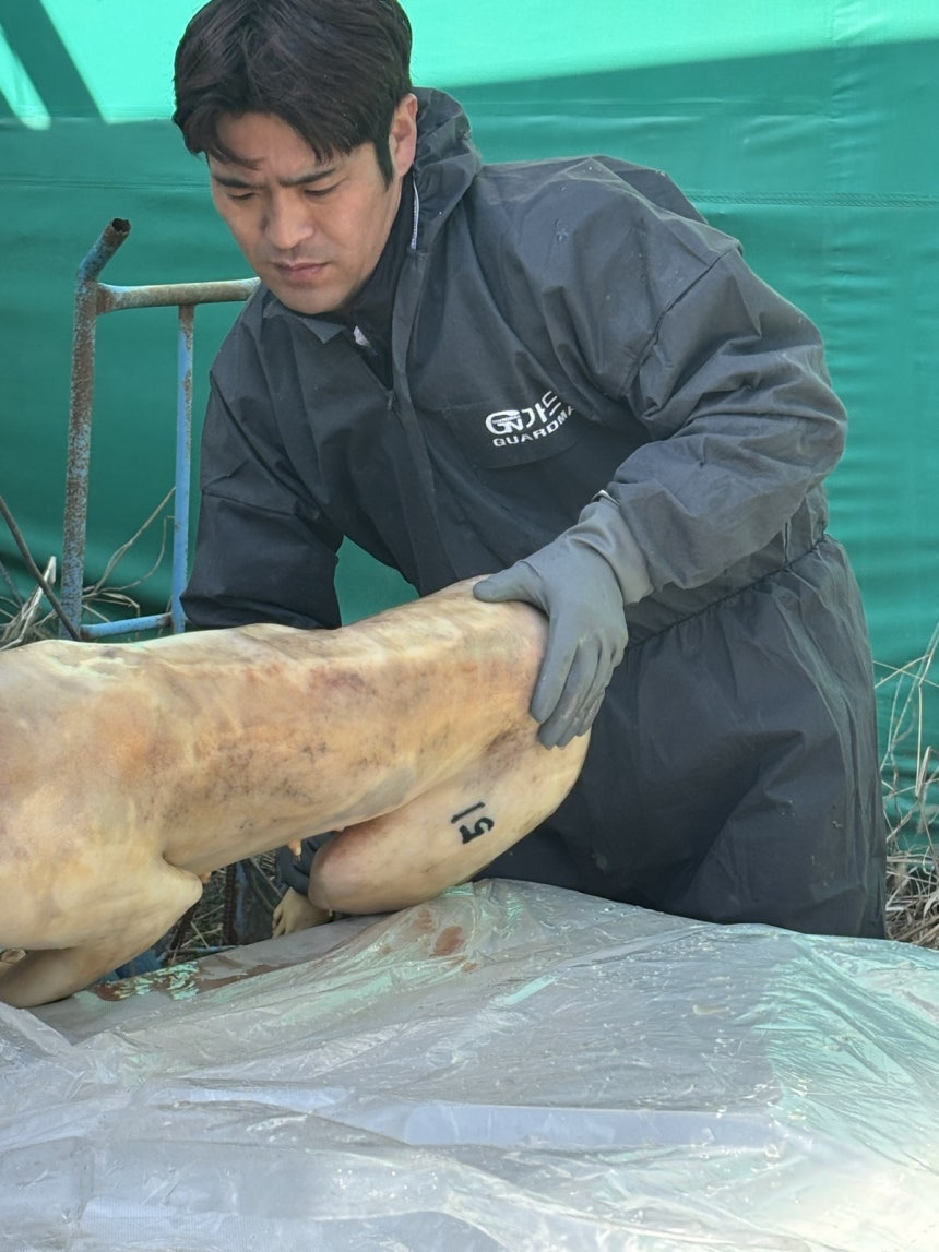 군산 개도살 사건 추모 시민행동 관계자가 불법 도살 후 냉동된 채로 방치된 개의 사체를 수습하고 있다. 군산 개도살 사건 추모 시민행동 제공
