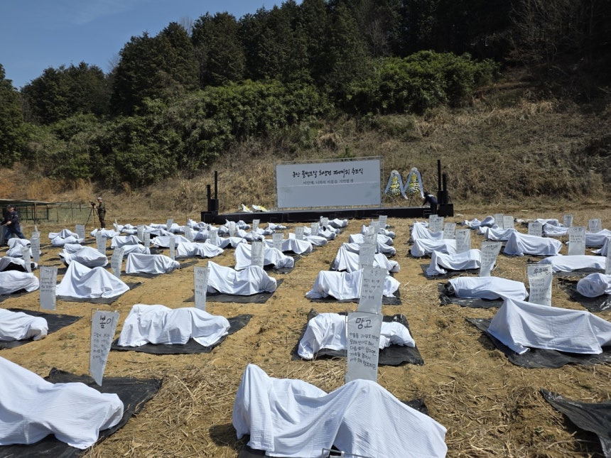 전날부터 전북 군산시 모처에서 이틀 동안 진행된 이번 장례·추모식은 도살된 후 냉동 창고에 방치된 개들을 시민의 힘으로 존엄하게 저 세상으로 보내는 자리로 전국 14개 반려동물 장례업체를 포함한 100개 단체, 시민 100여 명이 동참했다.