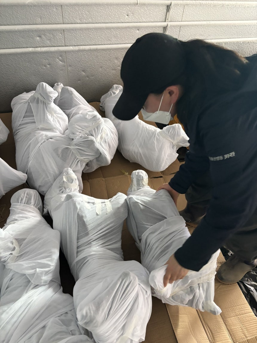 군산 개도살 사건 추모 시민행동 관계자들이 불법 도살 후 냉동된 채로 방치된 개의 사체에 광목천 수의를 입히고 있다. 군산 개도살 사건 추모 시민행동 제공