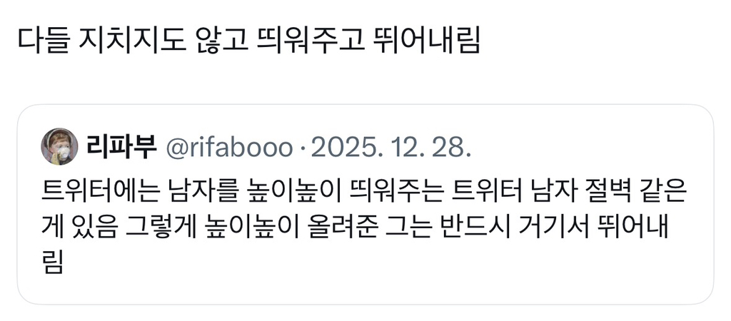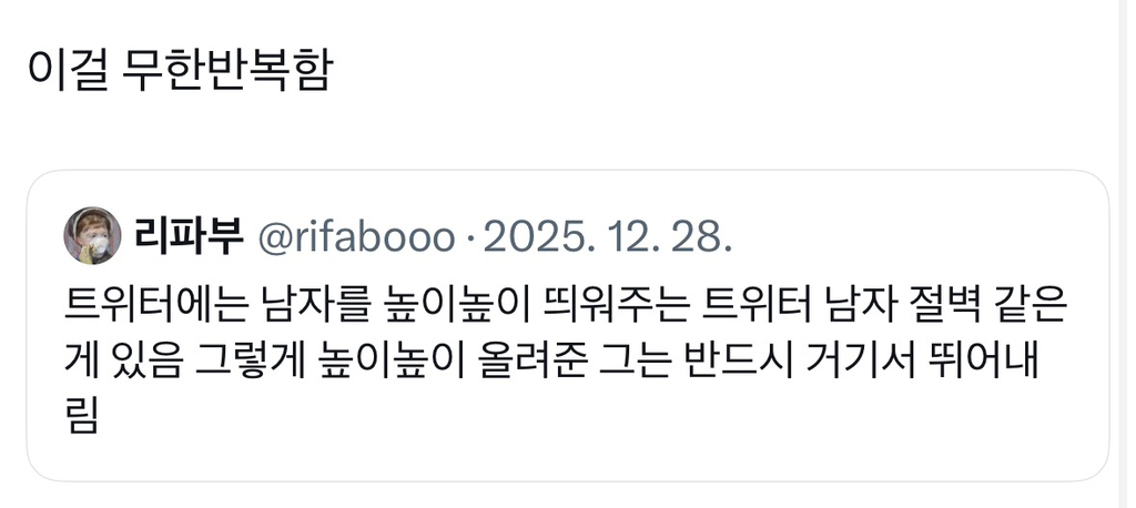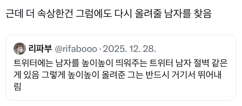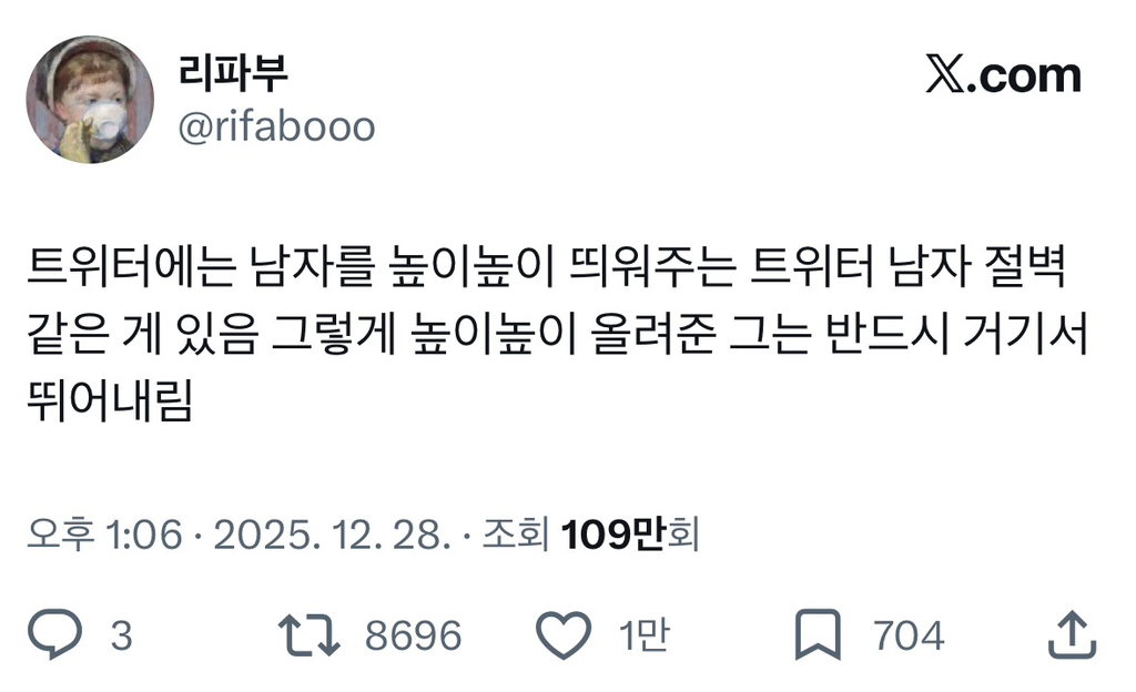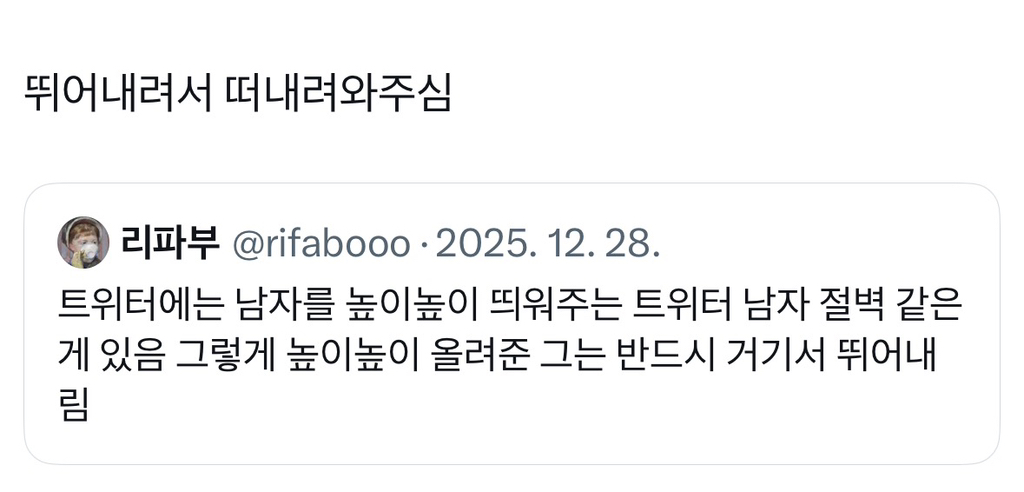 [스크랩] [흥미돋]트위터에는 남자를 높이 띄워주는 남자 절벽이 있음 작성자한입베어문|작성시간26.03.30|조회수3,632 목록 댓글 14 글자크기 작게가 글자크기 크게가 출처: https://x.com/rifabooo/status/2005128133092290999?s=46그렇게 높이높이 올려준 그는 반드시 거기서 뛰어내림트위터x대한민국o 다음검색 스크랩 원문 : *여성시대* 차분한 20대들의 알흠다운 공간 현재 게시글 추가 기능 열기 북마크 공유하기 신고 센터로 신고 댓글 댓글 14 댓글쓰기 답글쓰기 댓글 리스트 작성자익명의 여시 | 작성시간 26.03.30 잘가게 작성자누구스 | 작성시간 26.03.30 ㅋㅋㅋㅋㅋ 개웃기네 작성자클로드v2 | 작성시간 26.03.30 대단해~~~ 작성자박박디라라랴 | 작성시간 26.03.30 남자절벽이 아니라 남자띄워주는 뱅기가 먼저 아닌지 작성자흐린날이 잠자기 좋아 | 작성시간 26.03.30 분기별로 한명씩은 뛰어내리는듯 댓글 전체보기