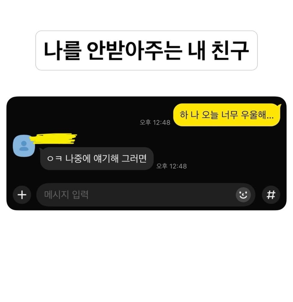 [흥미돋]나를 안 받아주는 내 친구 작성자여단오여|작성시간26.03.30|조회수84,374 목록 댓글 43 글자크기 작게가 글자크기 크게가 출처: 여성시대 여단오여 써먹자ㅋㅋ 다음검색 현재 게시글 추가 기능 열기 북마크 공유하기 신고 센터로 신고 댓글 댓글 43 댓글쓰기 답글쓰기 댓글 리스트 작성자배구노예 | 작성시간 26.03.30 와 난 안읽씹하는데 작성자아드리아해 | 작성시간 26.03.30 ㅋㅋㅋㅋㅋㅋ ㅇㅋ 나중에 얘기해 그러면 작성자매콤돈까스 | 작성시간 26.03.30 자주 저러는 사람이면 반응 이해감ㅋㅋㅋㅋㅋㅋ 작성자FLY TO THE SKY | 작성시간 26.03.31 시히히히ㅣㅣㅣ밬ㅋㅋㅋㅋㅋㅋㅋㅋㅋ큐ㅜㅠㅠㅠㅠ 작성자올해는취업하길 | 작성시간 26.04.13 ㅋㅋㅋㅋㅋ 댓글 전체보기