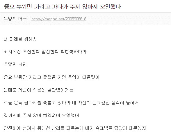 작성자움직여손들면쏜다 작성시간 26.03.30 팀장님 무슨 죄얔ㅋㅋㅋㅋ밥 먹으러 가는데 사원이 갑자기 길가에 앉아 오열함