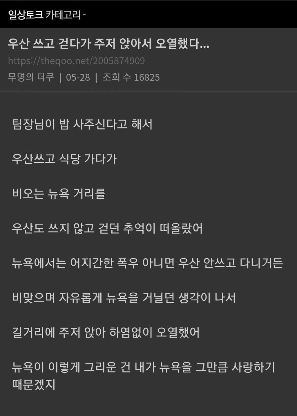 작성자짐볼테라피 작성시간 26.03.30 뉴욛은 솔직히 왜 욕먹는지잘모르겟음 ㅠㅠㅠㅋㅋㅋㅋㅋ 걍 저런 감성 누구나 한번은 가질수있지않남...