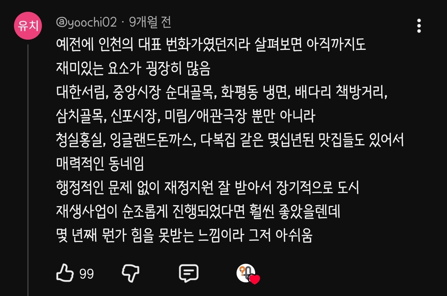 작성자춘식이너무귀야워!!!! 작성시간 26.03.30 신포시장이랑 어떻게 연결이 잘 되게끔 하면 좋을 거 같은데ㅠㅠ 요즘 개항장도 사람 많고 그런데 좀만 힘내 봐ㅠㅠ 차이나타운이랑 자유공원이랑 볼 거 많은데..!