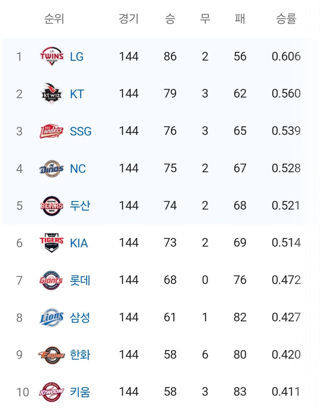 여기서 추려진 10개의 팀 중 상위 5팀은 포스트시즌으로