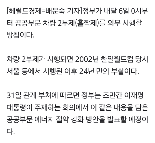 [여시뉴스데스크][단독]내달 6일부터 공공부문 차량 2부제 시행 검토…24년 만에 부활 작성자마구마구|작성시간26.03.31|조회수22,156 목록 댓글 399 글자크기 작게가 글자크기 크게가 출처: 여성시대 (마구마구)https://n.news.naver.com/article/016/0002622090 다음검색 현재 게시글 추가 기능 열기 북마크 공유하기 신고 센터로 신고 댓글 댓글 399 댓글쓰기 답글쓰기 댓글 리스트 작성자도ㅍr민 | 작성시간 26.04.01 기름 비싸게 사서 쓰겠다고 내가 ㅡㅡ 작성자핑크공룡쿠꾸 | 작성시간 26.04.01 주4일제로 표 쫀득하게 받아먹고 ;;; 작성자Happyy | 작성시간 26.04.01 미친거같음 재택시켜달라고 작성자iCELAND | 작성시간 26.04.01 회사까지 태워나주고 말해 진짜..미쳤나 대중교통이 전부 서울같은줄알아? 작성자지겹다지겨으 | 작성시간 26.04.02 지랄마 진짜 댓글 전체보기