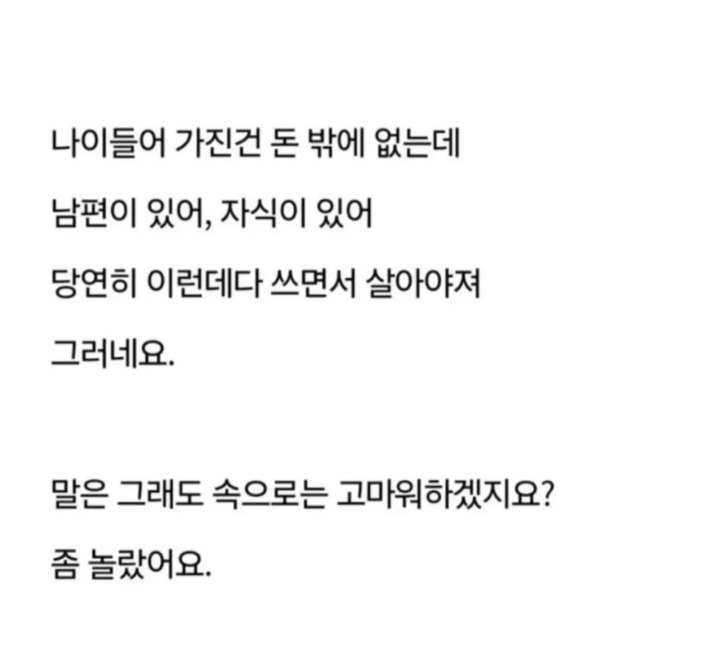 작성자정신차려각박한세상에서 작성시간 26.04.01 난 조카한테 돈 안쓰려고ㅇㅇ남혈육이 나한테 잘해준게 있어야 쓰지ㅋㅋㅋㅋㅋㅋㅋㅋ죽어서도 유서에다 내 전재산 사회로 기부돌려달라고 쓸거임