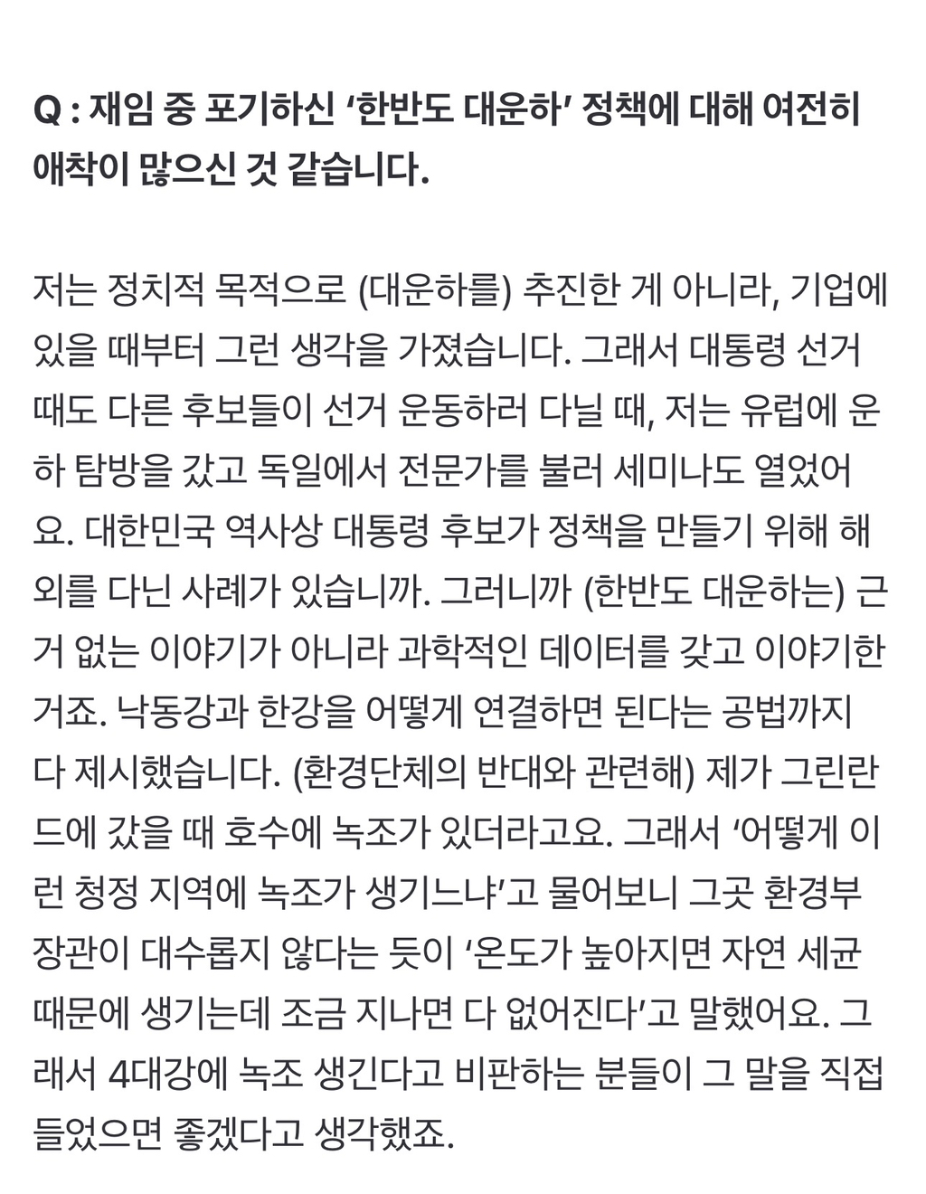 [여시뉴스데스크]그말 하니까 눈물이 다 나네” MB 울린 ‘한반도 대운하’ 좌절 [이명박 회고록].gisa 작성자정동남|작성시간26.04.01|조회수2,075 목록 댓글 49 글자크기 작게가 글자크기 크게가 출처:https://naver.me/xQJxZT6mMB “집값, 세금으로 못 잡아…공급도 신도시 방식은 아니다” [이명박 회고록]「 이명박 전 대통령 단독 인터뷰 ③ 」 이명박 정부는 역동적이었다. 국민이 ‘성장’을 체감할 수 있었던 거의 마지막 정부였다고 해도 과언이 아니다. 연 1%대의 저성장에 허덕이는 지금 되돌n.news.naver.com 다음검색 현재 게시글 추가 기능 열기 북마크 공유하기 신고 센터로 신고 댓글 댓글 49 댓글쓰기 답글쓰기 댓글 리스트 작성자두배짬봉 | 작성시간 26.04.01 2000년대 나라의 모든 문제점의 원흉이잖어 작성자Nikey | 작성시간 26.04.01 드가라 범죄자야 작성자안국동사거리 | 작성시간 26.04.01 오래도 사네 작성자오호오라하 | 작성시간 26.04.02 ㅅ발색기 도대체 깜빵까지 쳐 간 범죄자 말을 왜 듣냐 작성자엄마가광어야아빠가광어야 | 작성시간 26.04.02 저 눈꾸녕 댓글 전체보기