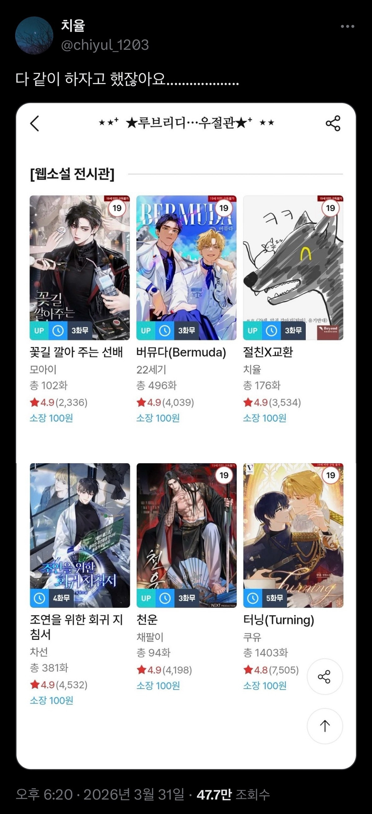[흥미돋]만우절 표지로 바꿨다가 당황한 BL 소설 작가.jpg 작성자스피드캣|작성시간26.04.01|조회수14,822 목록 댓글 44 글자크기 작게가 글자크기 크게가 출처: https://theqoo.net/square/4146569086타이밍이 어긋났는지 혼자만 바뀜 ㅋㅋㅋㅋㅋㅋㅋㅋ원래 표지는 이거지금은 다른 작품들도 전부 다 바뀌어 있음 다음검색 현재 게시글 추가 기능 열기 북마크 공유하기 신고 센터로 신고 댓글 댓글 44 댓글쓰기 답글쓰기 댓글 리스트 작성자레모ㄴr | 작성시간 26.04.01 <ㅡ가슴ㅡ> ㅋㅋㅋㅋㅋㅋㅋㅋㅋ 작성자뛰라노사우르스 | 작성시간 26.04.01 아앀ㅋㅋㅋ 작성자야자코코넛워터 | 작성시간 26.04.01 이건 문구만 빼면 일반 소설 표지 같이 퀄리티 쩔엌ㅋㅋㅋㅋㅋ 이미지 확대 작성자배추배추 | 작성시간 26.04.01 ㅋㅋㅋㅋㅋㅋㅋㅋㅋㅋㅋㅋㅋㅋㅋㅋㅋㅋ 아니 채팔헴 구렁이가 팔뚝에도 있고 고간에도ㅋㅋㅋ 작성자정댕만 | 작성시간 26.04.01 쩐운 ㅅㅂㅋㅋㅋㅋㅋㅋㅋㅋㅋㅋㅋㅋㅋㅋㅋㅋㅋ 댓글 전체보기