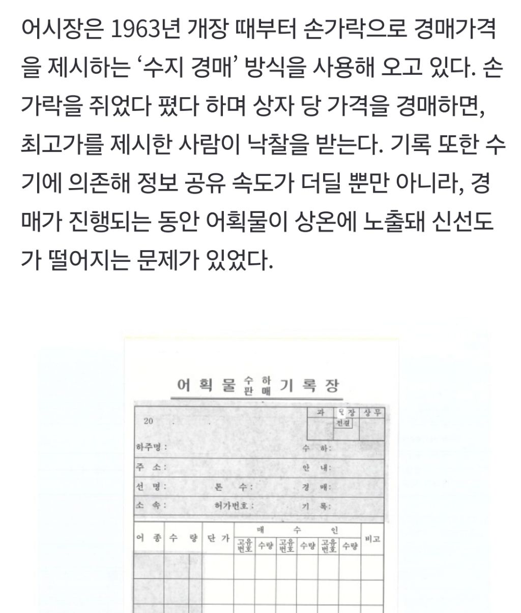작성자숲소 작성시간 26.04.02 가락시장도 수지에서 전자로 넘어갔는데 이쪽 전자경매가 단말기 버튼눌러서 경매하는거.. 시장이 되게 보수적이라 경매사 자체는 안없어질듯..? 수지경매가 아직까지 있었단게 놀랍다..