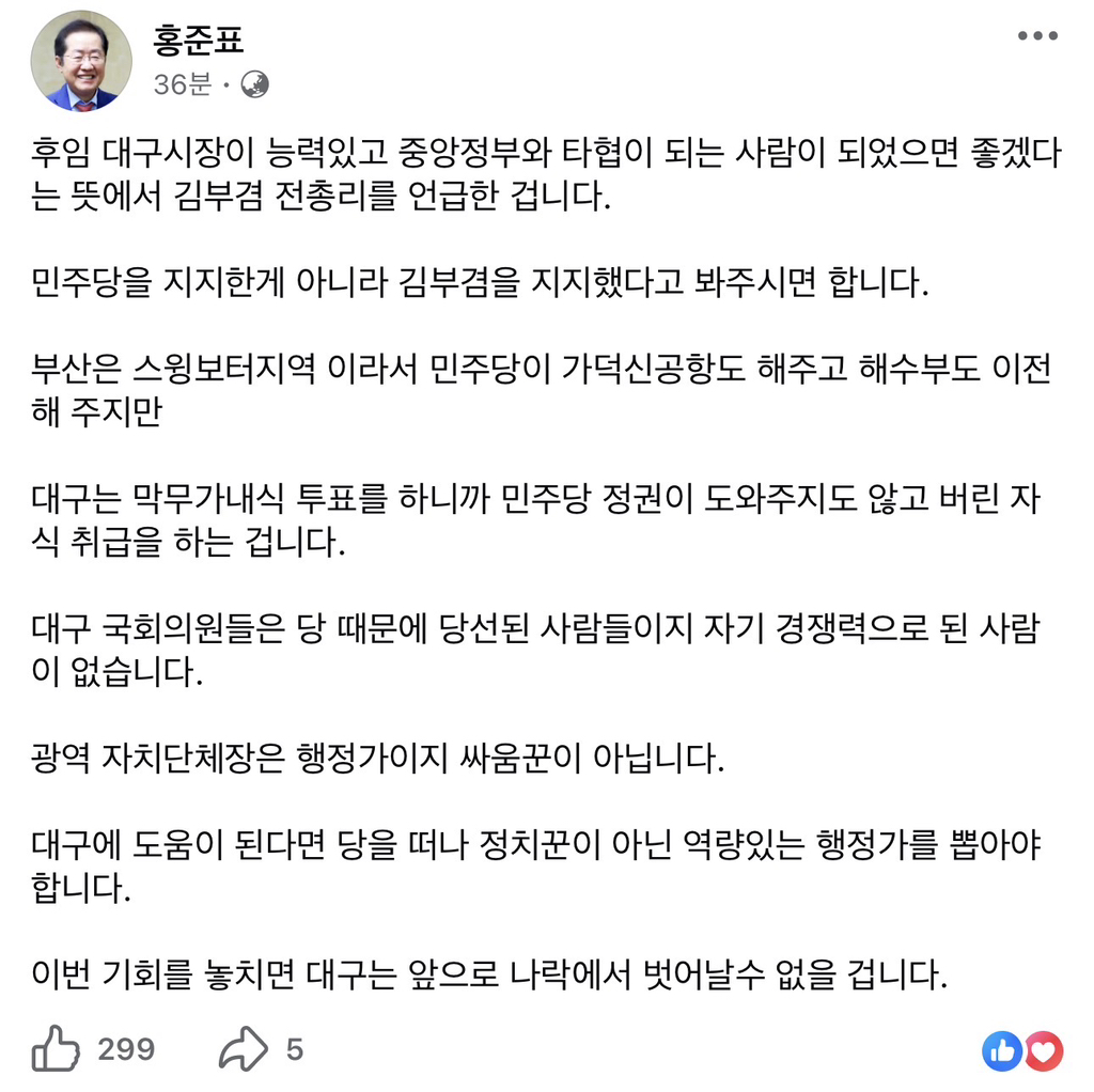 홍준표 전 대구시장이 공개적으로 6.3지방선거 대구시장 선거에서 김부겸 전 총리 지지 의사를 밝혔다.