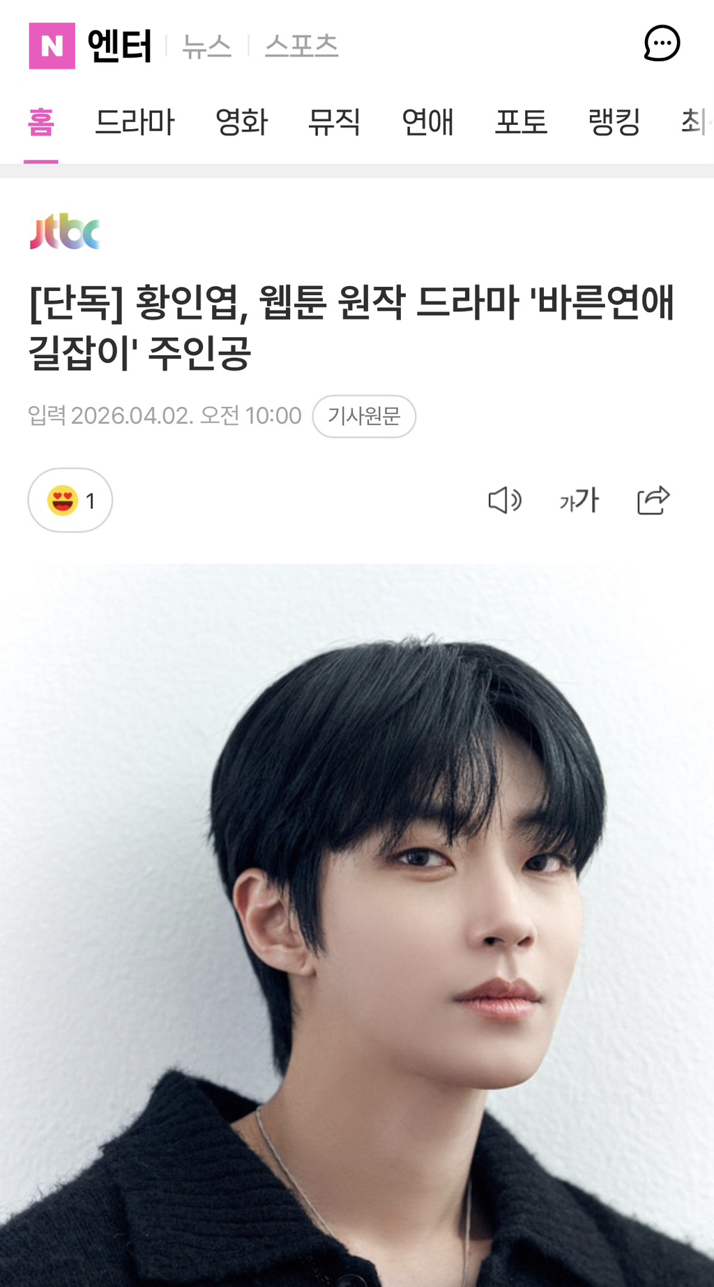 배우 황인엽이 화제의 웹툰 원작 드라마 '바른연애 길잡이'의 주인공을 맡는다.