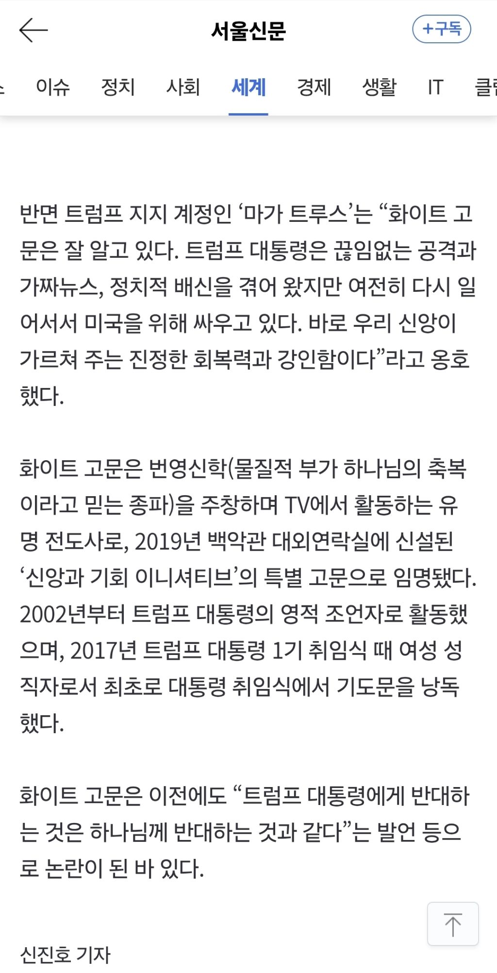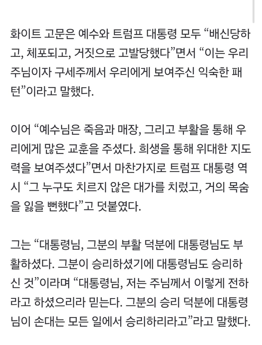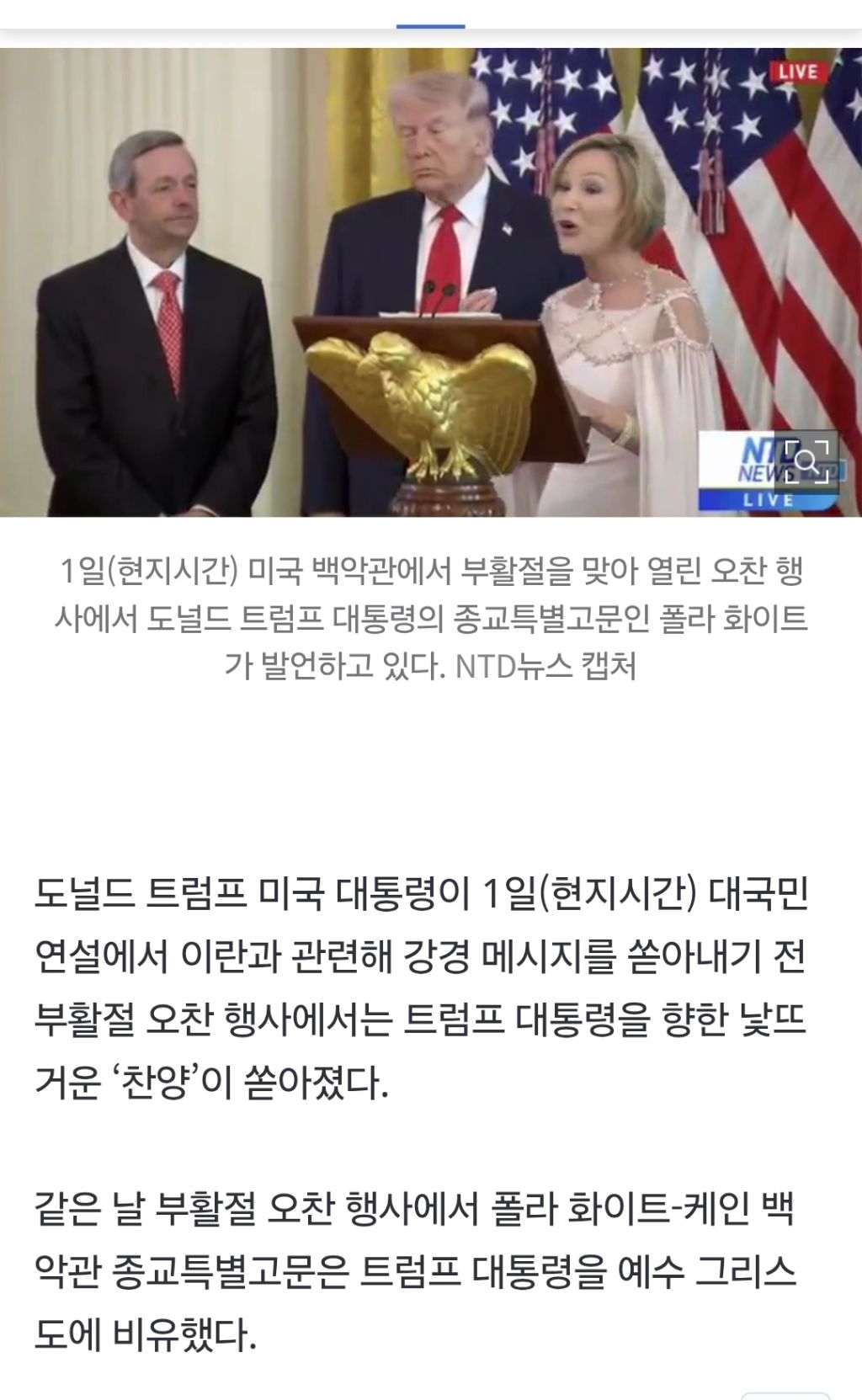 [여시뉴스데스크]“트럼프, 예수와 같은 고난”…백악관 부활절 행사서 낯뜨거운 ‘트비어천가’ 작성자제로템포|작성시간26.04.02|조회수2,759 목록 댓글 29 글자크기 작게가 글자크기 크게가 출처: https://naver.me/GRDv5mllhttps://naver.me/GRDv5mll“트럼프, 예수와 같은 고난”…백악관 부활절 행사서 낯뜨거운 ‘트비어천가’도널드 트럼프 미국 대통령이 1일(현지시간) 대국민 연설에서 이란과 관련해 강경 메시지를 쏟아내기 전 부활절 오찬 행사에서는 트럼프 대통령을 향한 낯뜨거운 ‘찬양’이 쏟아졌다. 같은 날 n.news.naver.com 다음검색 현재 게시글 추가 기능 열기 북마크 공유하기 신고 센터로 신고 댓글 댓글 29 댓글쓰기 답글쓰기 댓글 리스트 작성자올해꼭스피또1등당첨될겁니다 | 작성시간 26.04.02 전부 다 정신병자들 같음 작성자루비비키 | 작성시간 26.04.02 음 진짜 이건 아니다… 정치결탁 종교는 다 저렇게 변질되는 것 같음 작성자갓생삽니다 | 작성시간 26.04.02 사이비 작성자별안간 화가 나요 | 작성시간 26.04.02 왜저래병신새끼 작성자unknown22 | 작성시간 26.04.03 폴라 화이트가 진짜 비선실세여 뭐여. 옆에서 입김 불면서..ㅎ 댓글 전체보기