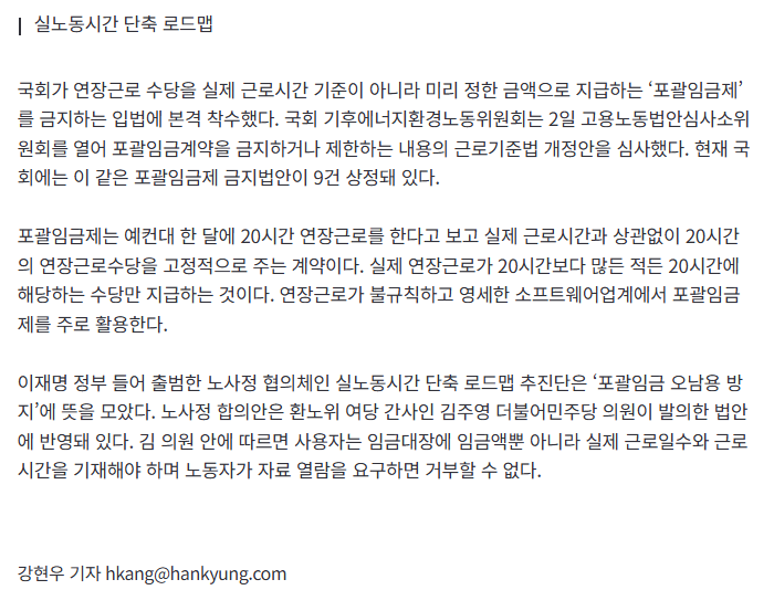 [여시뉴스데스크]與 '포괄임금제 금지' 입법 착수 작성자오동통통|작성시간26.04.03|조회수10,738 목록 댓글 180 글자크기 작게가 글자크기 크게가 출처: https://n.news.naver.com/article/015/0005270357與 '포괄임금제 금지' 입법 착수국회가 연장근로 수당을 실제 근로시간 기준이 아니라 미리 정한 금액으로 지급하는 ‘포괄임금제’를 금지하는 입법에 본격 착수했다. 국회 기후에너지환경노동위원회는 2일 고용노동법안심n.news.naver.com 다음검색 현재 게시글 추가 기능 열기 북마크 공유하기 신고 센터로 신고 댓글 댓글 180 댓글쓰기 답글쓰기 댓글 리스트 작성자낭낭낭반지 | 작성시간 26.04.04 ㅈㅂ 작성자나일론 머스크 | 작성시간 26.04.04 굿굿 진짜 얌체같은법이라고생각했음저것땜에 기본급은 개쪼그맣게 잡힌다고ㅡㅡ 작성자CANDLE | 작성시간 26.04.04 제발 ㅠㅠㅠㅠ 지금 다녔던 곳이나 전에 다니던 회사들 다 포괄이었어 ㅅㅂ 작성자행복은 곧 길이다 | 작성시간 26.04.04 ㅈ뷰ㅠㅠ와 작성자공차플로트 | 작성시간 26.04.04 ㅈㅂ 사측인가 억지 뭐임ㅋㅋㅋㅋ 댓글 전체보기