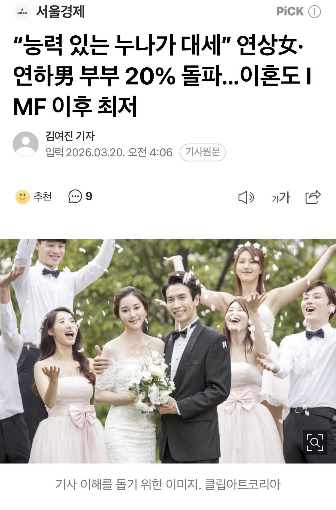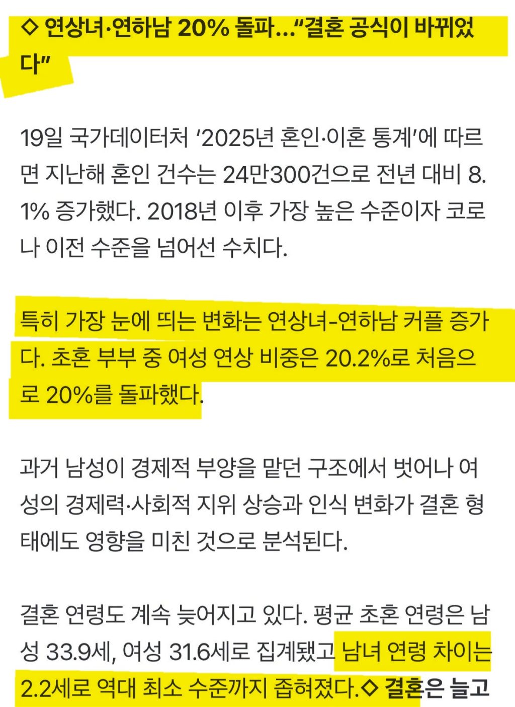 작성자햄멩이 작성시간 26.04.04 근데 좀 진짜 세대차이가 있어서 결혼에 압박을 받는 세대는 영원히 결혼 하고, 그렇지 않은 세대는 일부만 결혼하는거 같긴 함. 그리고 한남들 자아도취에 챙김받고 싶어해서 원래 돈많은 여자 좋아하더만. 본문 댓도 돈 많은 여자한테 취가하고 싶다는 욕망이 읽힘. 돈없는 돈경을 왜 여자들이 굳이..