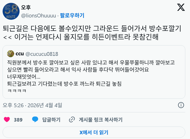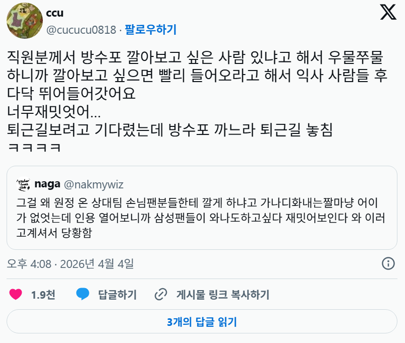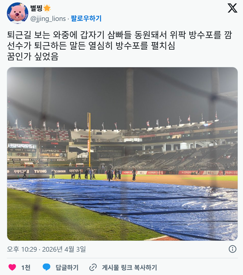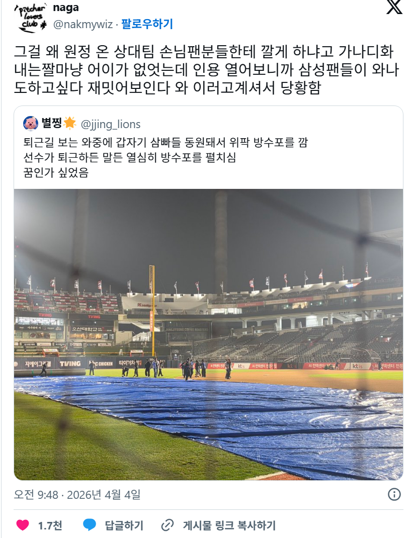 어제 있었던 일인데 방수포 넣어놓는 박스가 원정팀 좌석 근처에 있었나봄ㅋㅋㅋ