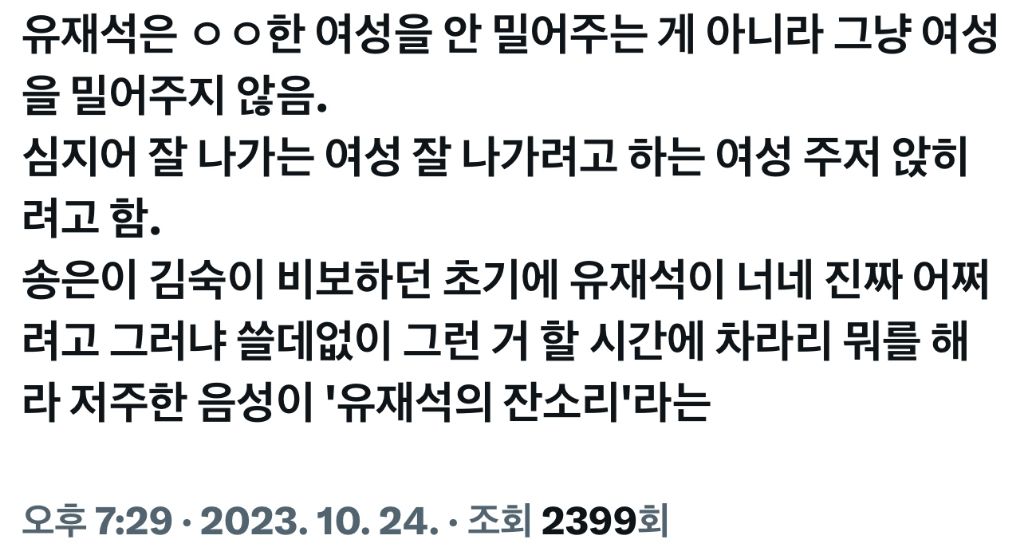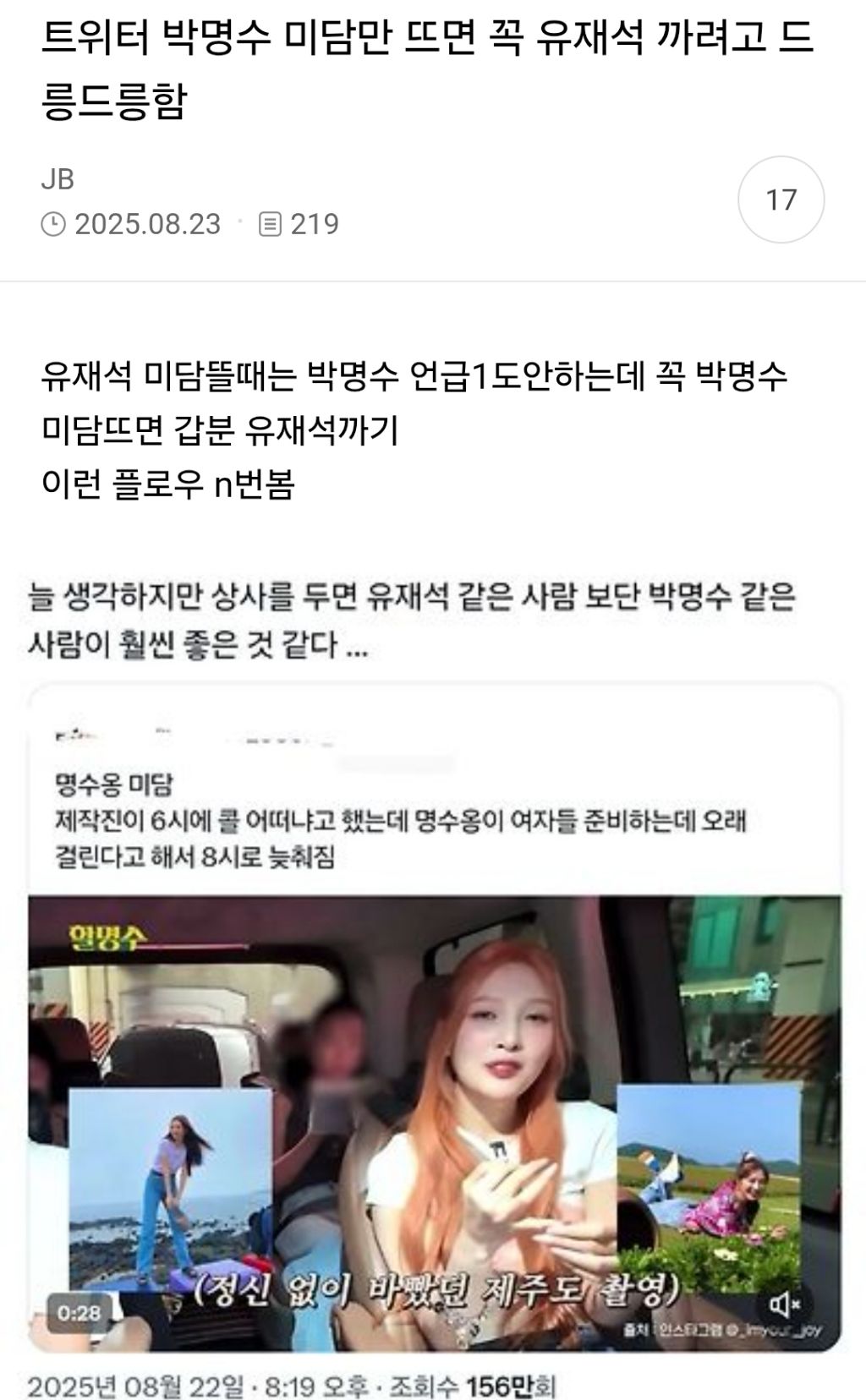 작성자여보세요여보아닌데 작성시간 26.04.06 유재석 까면서 가만있는 재재나 김숙등등 여연 끌고오와서 비교하거나 안챙겨준다고 ㅈㄹㅈㄹ 이게 더 괘씸함 정작 그 연옌 팬도 아니면서 깔려고 이용하는게 진짜 개빡쳐 난 재재팬인데 뻑하면 트위터에서 머리채잡혀 괜히 욕먹고 억울..
