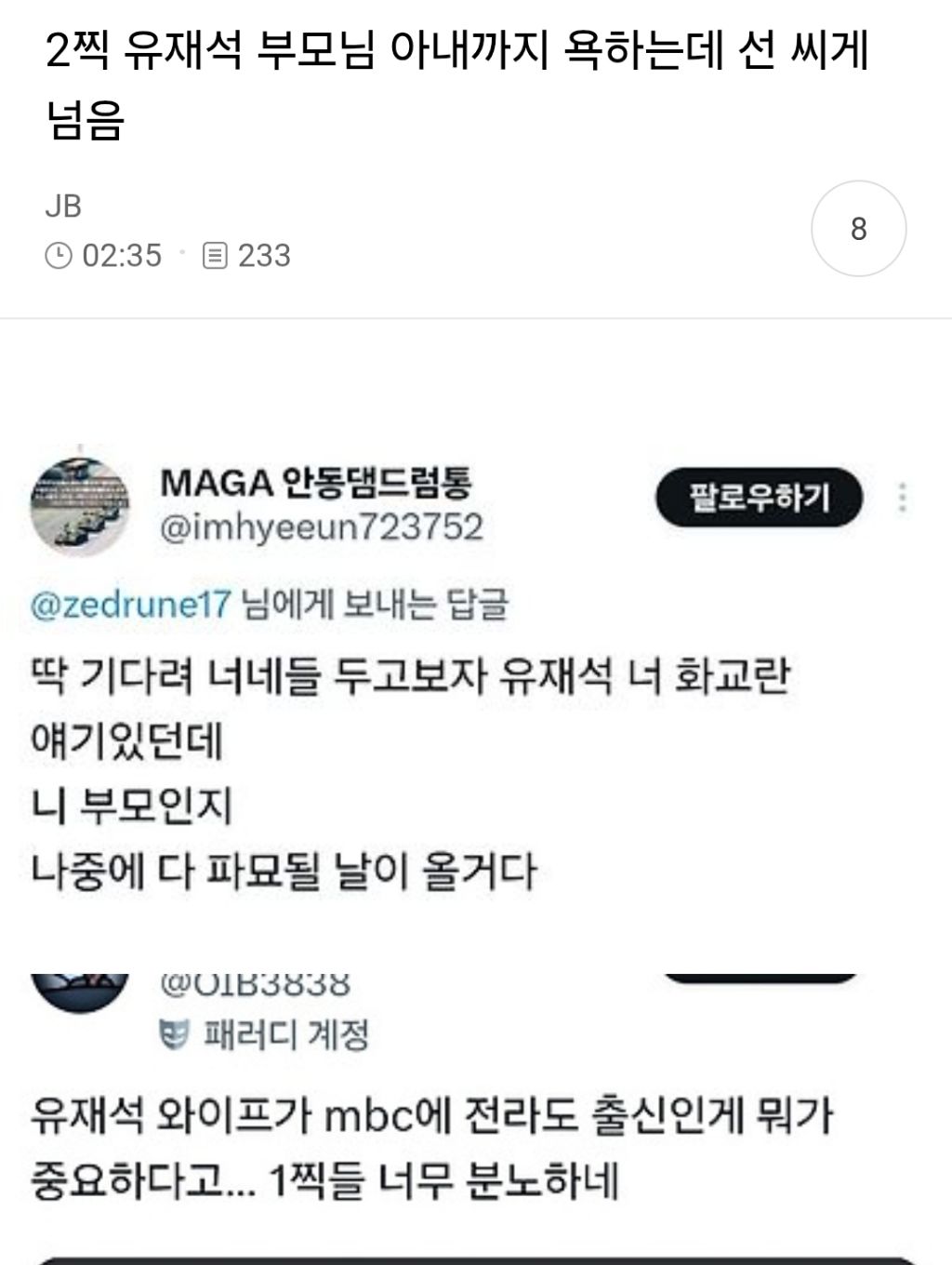 작성자몰아주세요!뭐 양이야? 작성시간 26.04.06 개한심하다 진짜 유재석 억까 존나 심한거 같음 그냥 만만한거 같음 고소 공지는 내지만 고소는 안하니까 더 날뛰는듯 ;; 유재석은 그래봤자 커리어 최고에 인맥 좋고 기부하고 가족이랑도 잘 살고 갓생사는데