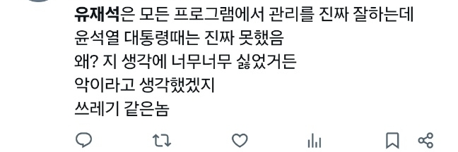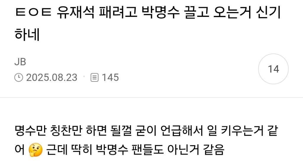 유퀴즈 이후 사라졌는데 요즘은 무한도전 함께 했던 박명수를 데려와 유재석 패는거로 바뀐듯 (까글에 우파페미들 많음)