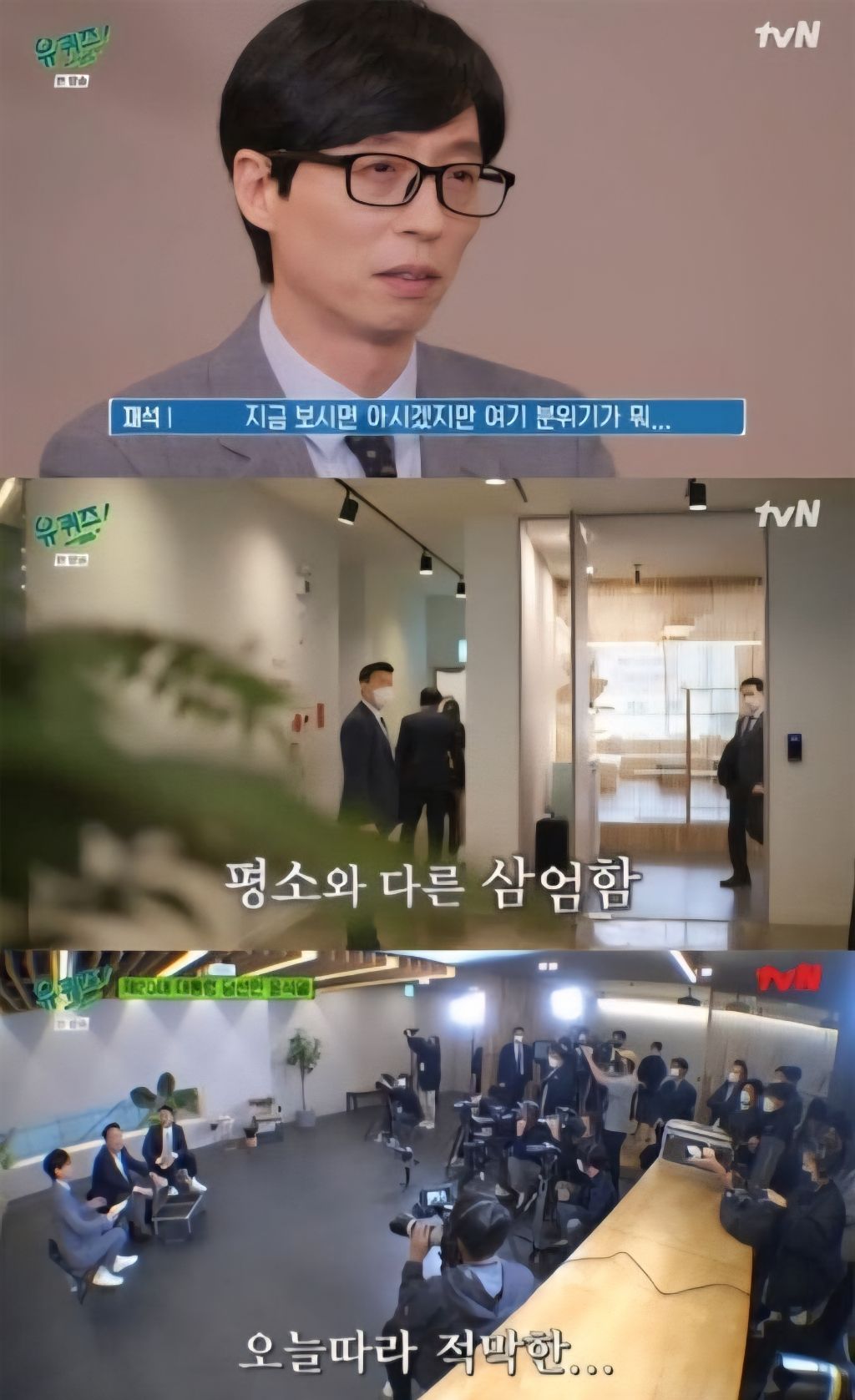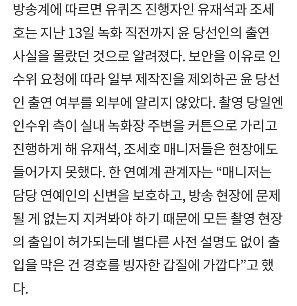 취재결과 촬영 직전까지 찐으로 몰라 기자들이 인수위 측에 입장을 요청했지만 답변을 받지 못함 (굥 출연 이후 얼마 못가 종영 했고 유퀴즈를 만들었던 메인피디 2명 이적 선언, CP 작가 자막 등 전부 바뀜)