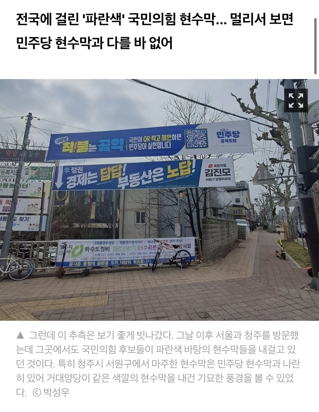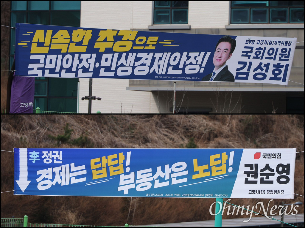 ▲3월 30일 오후 경기도 고양시 덕양구 도내동 LX한국국토정보공사 고양지사앞 네거리에 민주당 고양시(갑) 지역위원장인 김성회 의원과 국민의힘 고양시(갑) 권순영 당협위원장의 현수막이 나란히 내걸려 있다. 김성회 의원 현수막은 민주당 상징색인 파란색을 배경으로 제작되었으나, 권순영 당협위원장의 현수막은 국민의힘 상징색인 빨간색이 아니라 민주당 상징색인 파란색으로 제작되어 있다.권우성