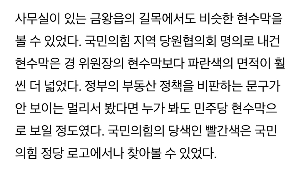 ▲분명 우리 지역의 국민의힘 당협위원장인 경대수 위원장의 현수막인데 더불어민주당의 당색인 파란색을 바탕으로 하고 있었다. "'사법파괴 3법'으로 李(이) 사법리스크 지우기"라는 이재명 대통령을 비판하는 문구가 파란색 바탕에 적혀 있으니 잘못 봤나 싶었다.박성우