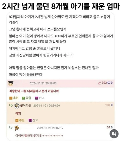 [스크랩] [흥미돋]2시간 넘게 울던 8개월 아가를 재운 엄마 작성자잠이온다다|작성시간26.04.06|조회수114,684 목록 댓글 39 글자크기 작게가 글자크기 크게가 다음검색 스크랩 원문 : 도탁스 (DOTAX) 현재 게시글 추가 기능 열기 북마크 공유하기 신고 센터로 신고 댓글 댓글 39 댓글쓰기 답글쓰기 댓글 리스트 작성자관심법사 | 작성시간 26.04.07 ㅋㅋㄱㅋㄱㄱㅋㄱㅋㅋ 근데 두시간동안 힘빼고 울고 해서 잔거일듯 작성자고양이지롱 | 작성시간 26.04.07 ㅋㅋㅋㅋㅋㅋㅋㅋㅋㅋㅋㅋㅋㅋㅋㅋㅋㅋㅋㅋㅋㅋㅋㅋㅋㅋㅋ댓글 너무웃기네 작성자상대적박박디라락 | 작성시간 26.04.07 아 웃겨 ㅋㅋㅋㅋㅋㅋㅋㅋㅋㅋㅋㅋㅋㅋ 작성자됴롱롱맨돗 | 작성시간 26.04.07 애갸 해명좀 작성자아뮤거나 | 작성시간 26.04.13 드뎌 엄마가 내말귀를 알아들엇군.. 댓글 전체보기