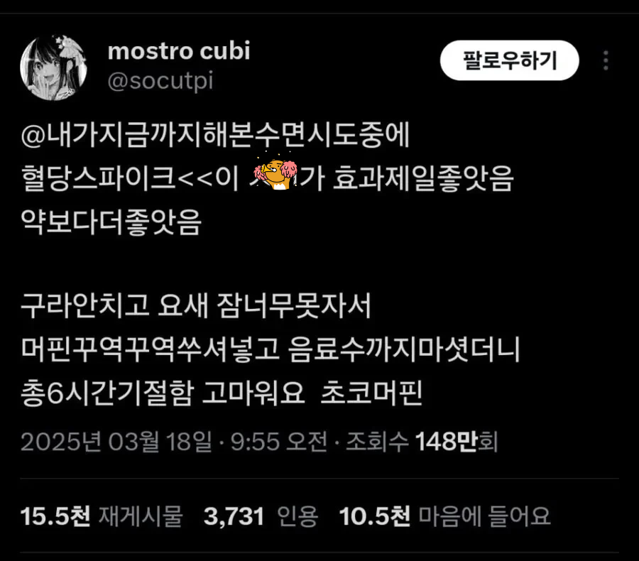 작성자와이라노사우루스 작성시간 26.04.08 나도 어제 혈스로 퇴근하자마자 자서 8시간 꿀잠자고 일어남 ^_^