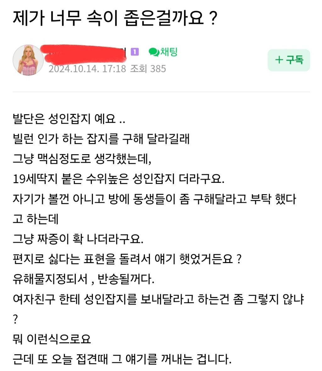 [스크랩] [칵.cxxx]남자들 죄짓고 감옥가면 옥바라지 해주는 여친/아내 에게 부탁하는것 작성자두물머리핫도구|작성시간26.04.08|조회수8,857 목록 댓글 89 글자크기 작게가 글자크기 크게가 출처: 여성시대 (역류성식도염탈출)안사람,안쪽이=감옥안쪽에 들어가있는 사람범죄 저질러서 감옥 들어가있는 주제에옥수발드는 여친/아내한테 음란물 보내달라 부탁하기..ㅎ그렇다고 옥바라지 하는 여자들 불쌍해하거나 안타까워해주지는 않아도 됨범죄자들 우글거리는 교도소에 굳이 본인 노출사진 보내주고싶어서 안달났기때문.. 다음검색 스크랩 원문 : *여성시대* 차분한 20대들의 알흠다운 공간 현재 게시글 추가 기능 열기 북마크 공유하기 신고 센터로 신고 댓글 댓글 89 댓글쓰기 답글쓰기 댓글 리스트 작성자알밤크림빵 | 작성시간 26.04.09 진심 지능이 일반인 수준 아닐거 같음 작성자니가하면나도한다 | 작성시간 26.04.09 얼마나 모질라야 저럴수있을까 작성자말랑캉우 | 작성시간 26.04.09 고등생물 아닌듯ㅋㅋ 작성자반짝-반짝- | 작성시간 26.04.09 지능이 반쪽인가보네 작성자봄쭈꾸미 | 작성시간 26.04.09 남범죄자남들 가소롭네 ㅋㅋㅋㅋㅋㅋㅋㅋ 살만한가봐? 생존욕구만 들게끔 해줘야하는데 댓글 전체보기