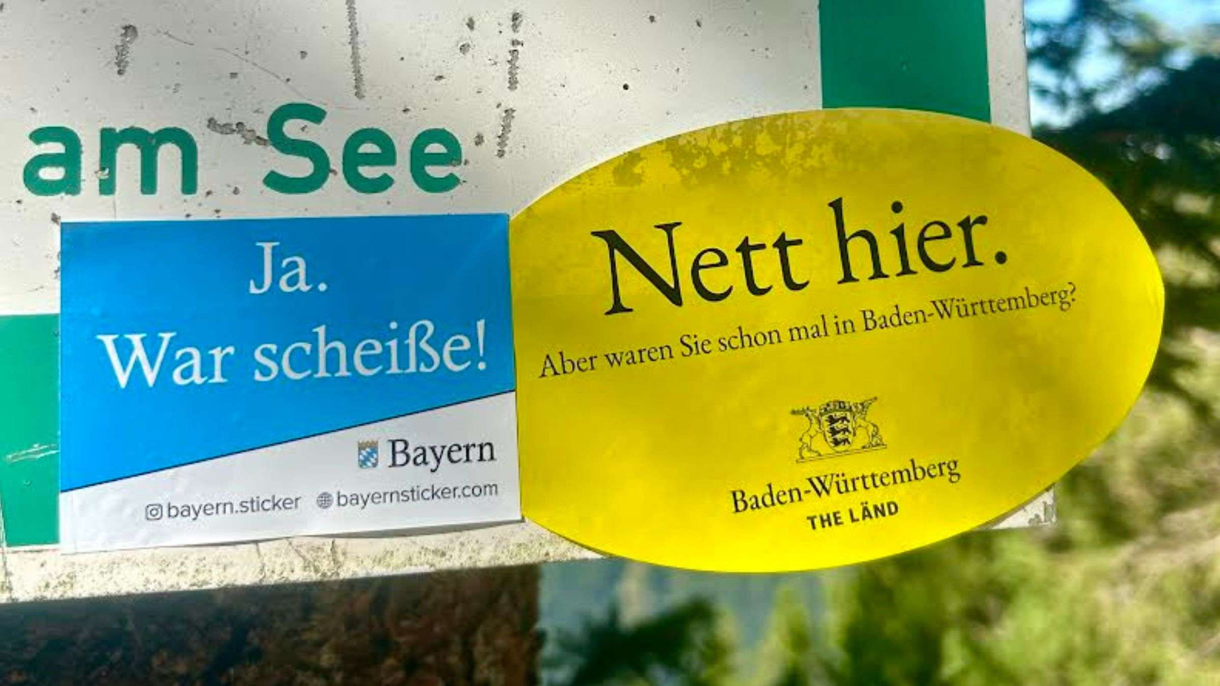 예를 들면 이렇게 오리지널 ‘Nett hier.’ 스티커 옆에 "Ja. War scheiße! (어. 끔찍하던데!)" 와 같은 반박 스티커를 붙이는가하면(보다시피 바이에른 스티커임.),
