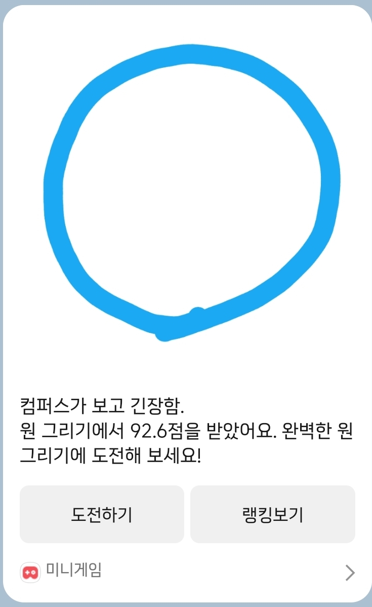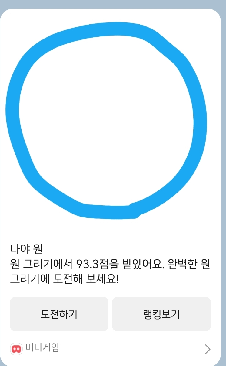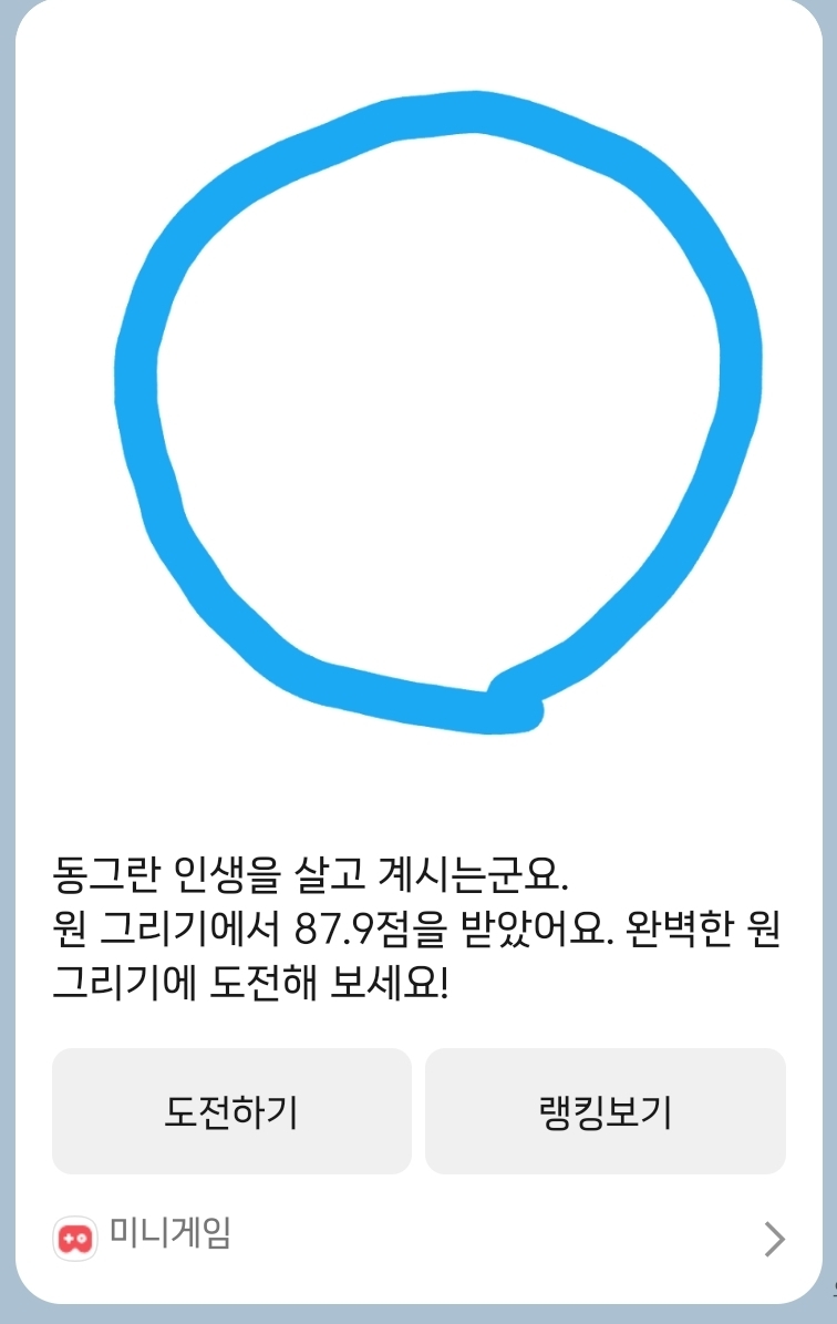 [흥미돋]카톡 원그리기 대결 기능 작성자정가거부|작성시간26.04.08|조회수8,282 목록 댓글 35 글자크기 작게가 글자크기 크게가 출처: 여성시대 정가거부최대한 똥글뱅이에 가깝게 그리면 됨단톡방에서 하면 순위도 볼 수 있음하는 방법카톡> 채팅방 (혼자할거면 나와의채팅, 단체전은 단톡방)> 좌측하단 + 누르기 > 미니게임> 원그리기 다음검색 현재 게시글 추가 기능 열기 북마크 공유하기 신고 센터로 신고 댓글 댓글 35 댓글쓰기 답글쓰기 댓글 리스트 작성자덩그릴리 | 작성시간 26.04.09 만족 이미지 확대 답댓글 작성자레이닝데이 | 작성시간 26.04.09 헐 대박 똥그래 작성자빙방구 | 작성시간 26.04.09 이미지 확대 작성자새나라의어린이v | 작성시간 26.04.09 96.7 이미지 확대 작성자않잖아요 | 작성시간 26.04.11 더이상 안나와 ㅠㅠ 이미지 확대 댓글 전체보기