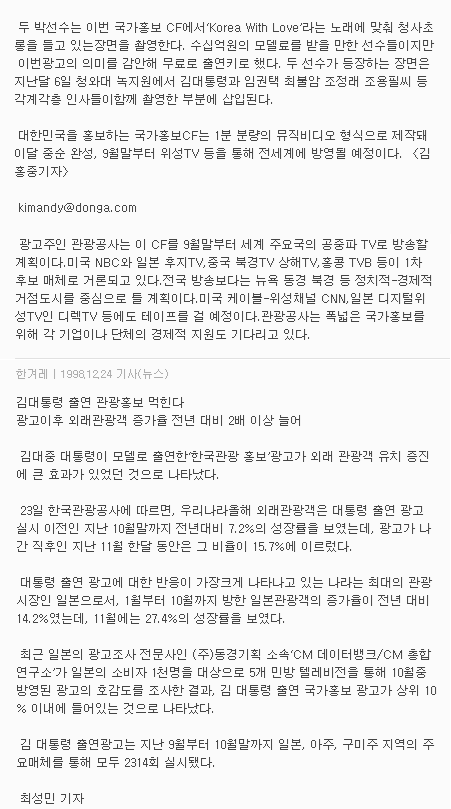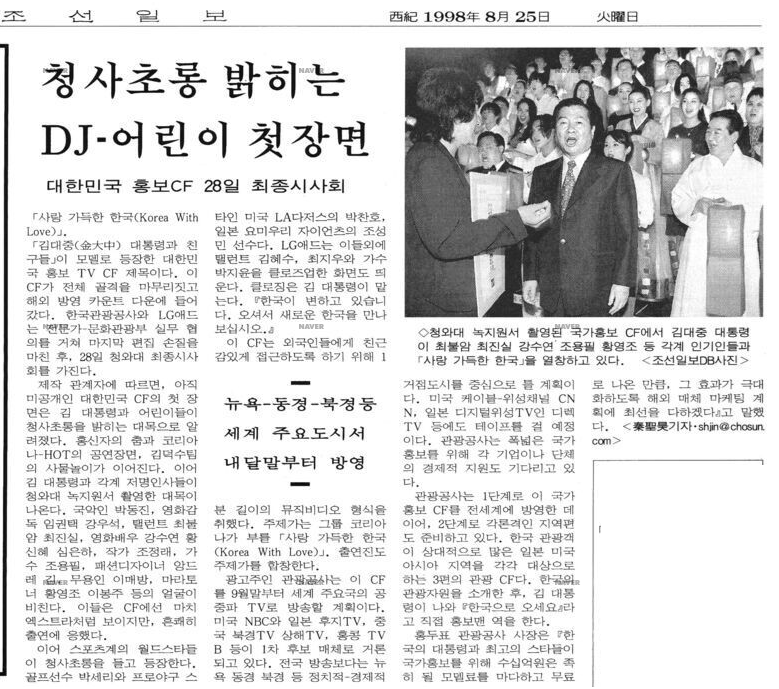 1998년 7월(단체촬영은 청와대 녹지원에서 촬영/기타 경복궁, 남산 등에서 촬영) 문화관광부와 한국관광공사가 해외 관광객 유치와 국가이미지 제고를 위해 제작한 국가홍보 CF