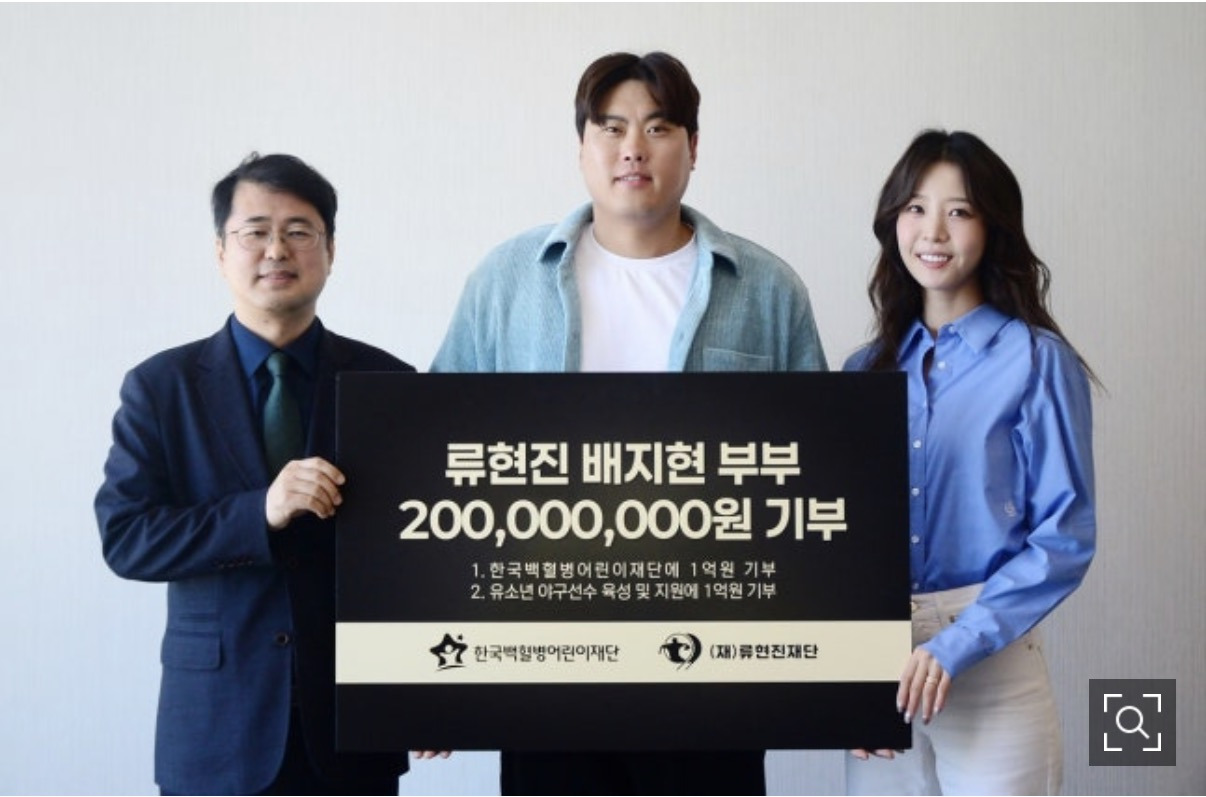 류현진 재단은 류현진·배지현 부부가 유소년 야구 육성과 소아암 환아 지원을 위해 각각 1억원씩 총 2억원을 기부했다고 9일 밝혔다.