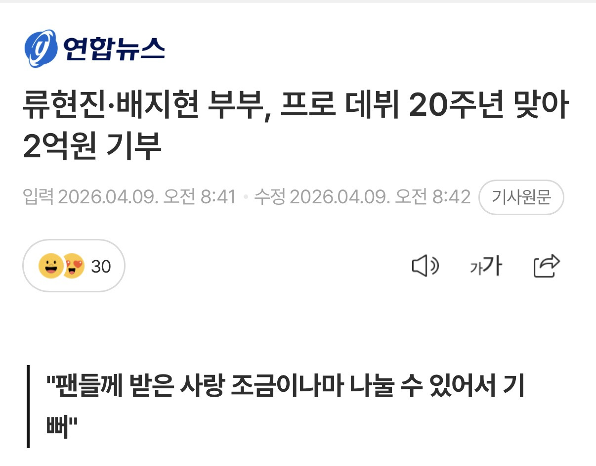 (서울=연합뉴스) 이대호 기자 = '코리안 몬스터' 류현진과 배지현 전 아나운서 부부가 류현진의 프로 데뷔 20주년을 기념해 2억원을 기부했다.