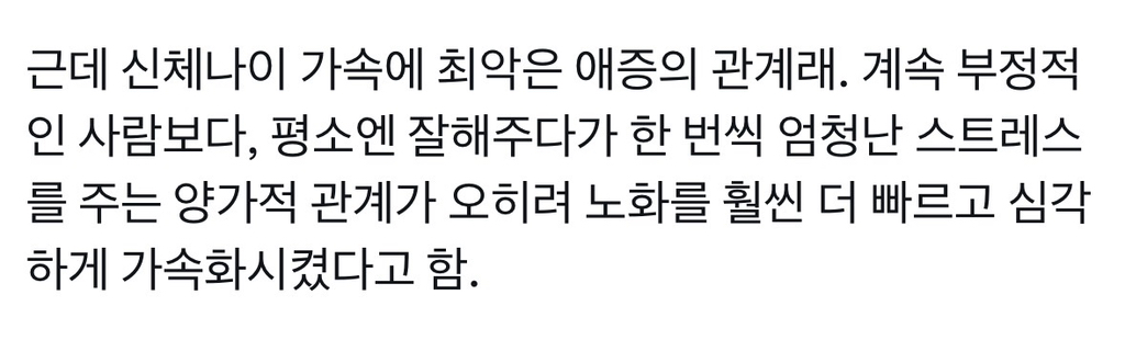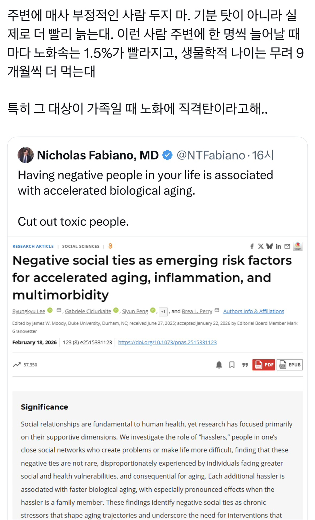[흥미돋]신체나이 가속에 최악은 애증의 관계래 작성자cold brew|작성시간26.04.09|조회수84,652 목록 댓글 52 글자크기 작게가 글자크기 크게가 출처: https://x.com/adhd_hana/status/2041887497043767443?s=46소스: https://www.pnas.org/doi/10.1073/pnas.2515331123Negative social ties as emerging risk factors for accelerated aging, inflammation, and multimorbidity | PNASNegative social ties, or “hasslers,” are pervasive yet understudied components of social networks that may accelerate biological aging and morbidit...www.pnas.org 다음검색 현재 게시글 추가 기능 열기 북마크 공유하기 신고 센터로 신고 댓글 댓글 52 댓글쓰기 답글쓰기 댓글 리스트 작성자히히낙낙 | 작성시간 26.04.09 이래서 독립하고싶어하나 작성자빙글빙글돌아가는중 | 작성시간 26.04.09 와 직전 연애 진짜 .. 진짜 그랬어 작성자쉬를갈기지마세요 | 작성시간 26.04.09 헉 난가 작성자정보접근을 | 작성시간 26.04.10 우리팀...^^ 작성자치즈마들렌 | 작성시간 26.04.15 헐 우리집 댓글 전체보기