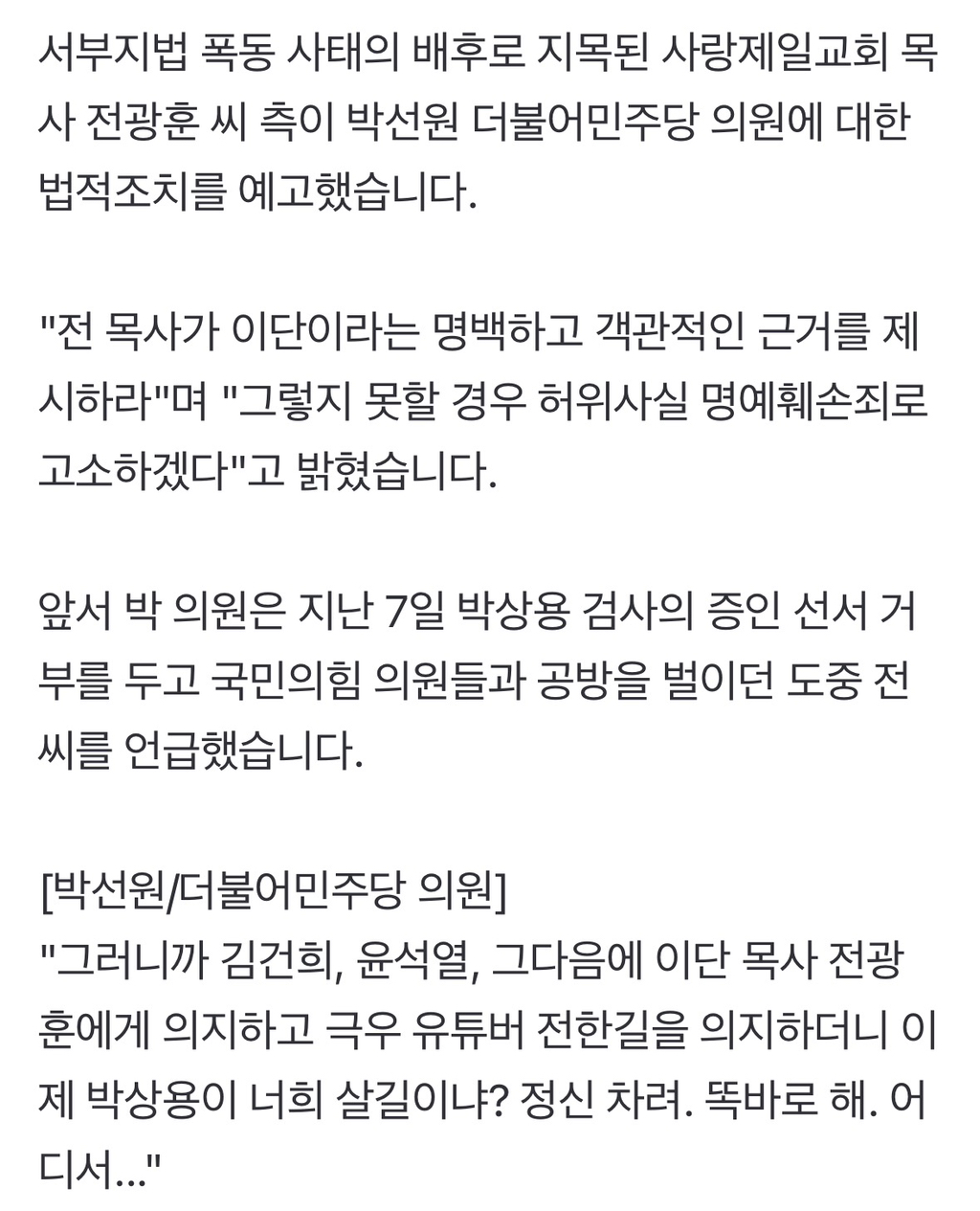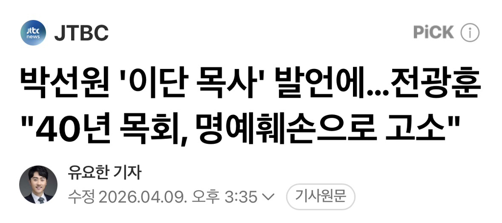 [여시뉴스데스크]박선원 '이단 목사' 발언에…전광훈 "40년 목회, 명예훼손으로 고소" 작성자소리앙|작성시간26.04.09|조회수706 목록 댓글 4 글자크기 작게가 글자크기 크게가 출처: https://naver.me/G2YUy4NV박선원 '이단 목사' 발언에…전광훈 "40년 목회, 명예훼손으로 고소"서부지법 폭동 사태의 배후로 지목된 사랑제일교회 목사 전광훈 씨 측이 박선원 더불어민주당 의원에 대한 법적조치를 예고했습니다. "전 목사가 이단이라는 명백하고 객관적인 근거를 제시하n.news.naver.com전문출처 다음검색 현재 게시글 추가 기능 열기 북마크 공유하기 신고 센터로 신고 댓글 댓글 4 댓글쓰기 답글쓰기 댓글 리스트 작성자조희대지귀연쥑이여 | 작성시간 26.04.09 아버지를 아버지라 부르지못하고 작성자역적45 | 작성시간 26.04.09 이단맞잖아 기독교협회에러 어쩍구 했잖앜ㅋㅋ 작성자들숨에 재 날숨에 명 | 작성시간 26.04.09 이단을 이단이라 부르지 뭐라 불러ㅋㅋ 사이비 주제에 작성자단발머리소녀 | 작성시간 26.04.10 이단을 이단이라 하지 ㅋㅋㅋㅋ 목사도 제명되지 않았나? 댓글 전체보기