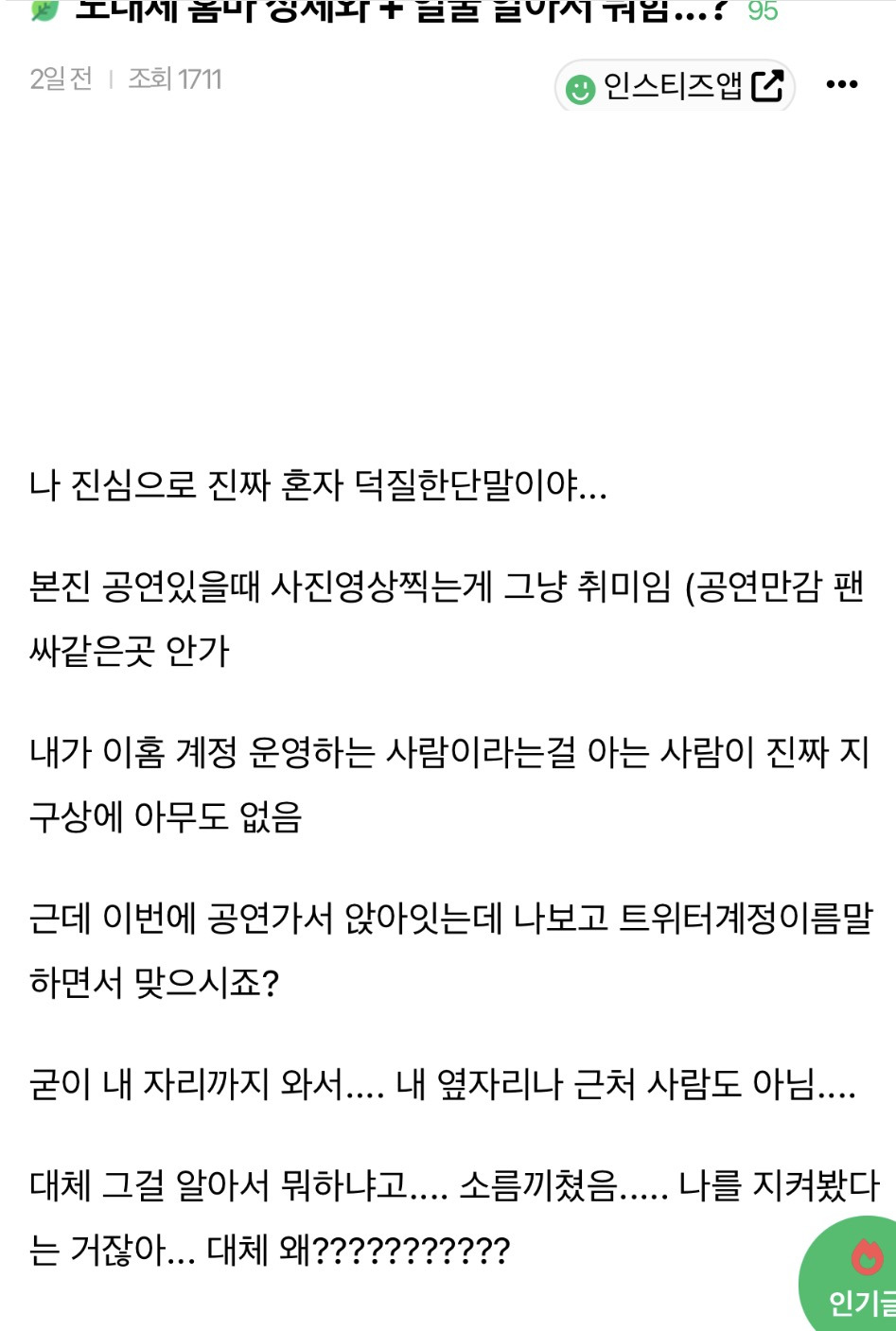 작성자더워추워더워추워 작성시간 26.04.09 우리 판에서 좀 뒤집어진? 일 있었는데 오프에서 같이 논 적 있어서 걍 얼굴만 알고 오프에서 인사하는 트친. 그뿐이었는데 그때 신상이 막 까이더라..; 자표 하긴 했던 것 같지만 그렇다고 해서 나처럼 어 뭐 터졌네 하고 걍 지켜보는 아무개한테도 넷상에서 신상 까발려질 일인가 소름.. 그 분 홈마도 네임드도 아니고 걍 새우젓1임..